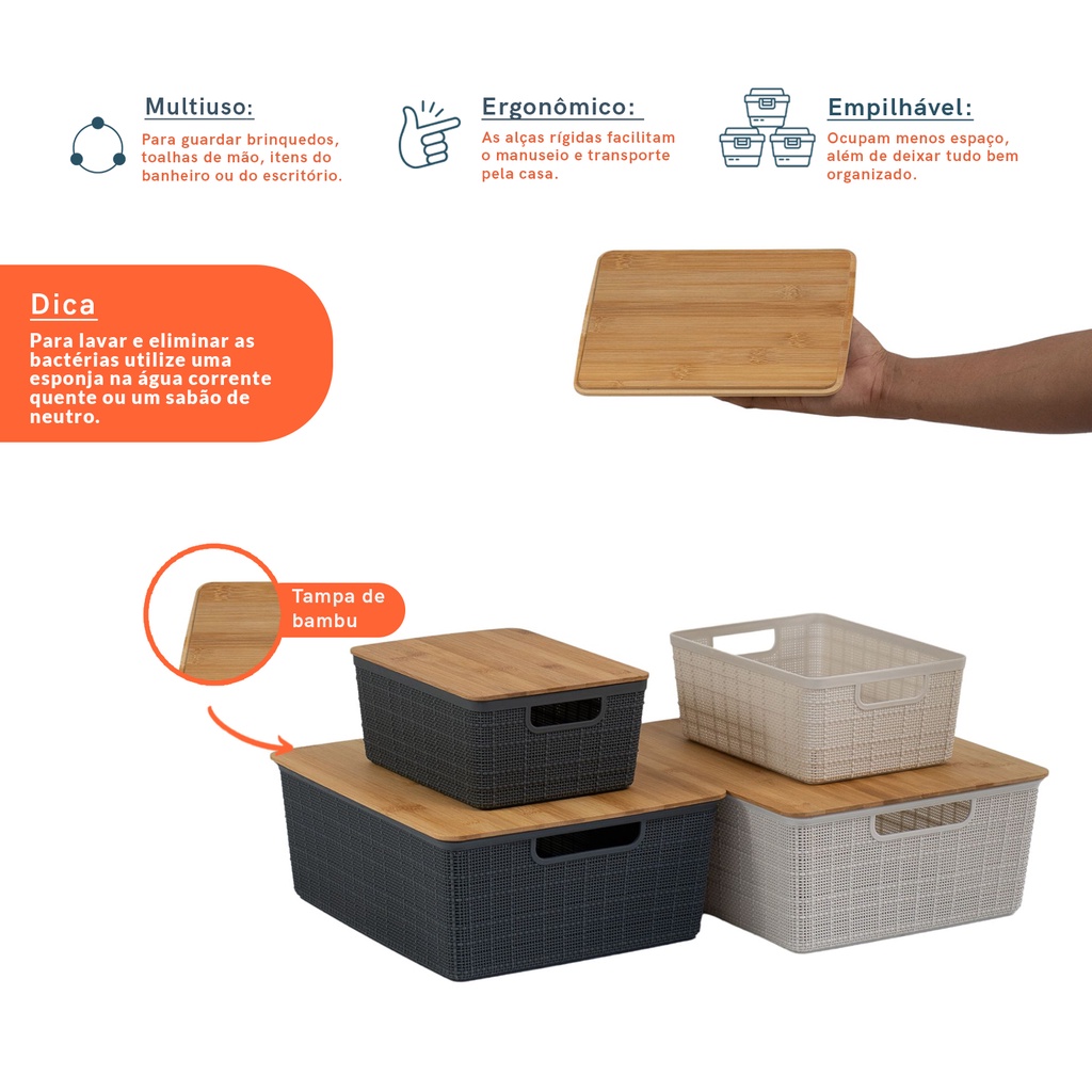 Esse é o Kit 4 caixas organizadoras tampa bambu 2p/2m branco/cinza Esse kit contém: 2 Caixas organizadoras com tampa de bambu 12l - Oikos 2 Caixas organizadoras com tampa de bambu 4l – Oikos Essas são as caixas organizadoras 12L com tampa de bambu da OIKOS. Prático: bom para organizar roupas, toalhas, lençóis, itens do banheiro, brinquedos, sapatos, materiais de escritório, produtos de limpeza e muito mais. Versátil: vai bem em qualquer ambiente da casa: do quarto ao banheiro, da sala ao escritório. você que manda! Empilhável: além de ser charmosa, a tampa de bambu permite empilhar uma caixa em cima da outra, otimizando os espaços e deixando tudo bem organizado. Fácil de carregar: as alças rígidas facilitam o manuseio e transporte pela casa. Decorativo: o design moderno e a mistura do plástico e do bambu harmonizam com diversos estilos de decoração, deixando sua casa mais arrumada e cheia de bossa. Tampa de bambu: material leve e ecologicamente correto. Essas são as caixas organizadoras 4L com tampa de bambu da OIKOS. Prático: bom para organizar roupas, toalhas, lençóis, itens do banheiro, brinquedos, sapatos, materiais de escritório, produtos de limpeza e muito mais. Versátil: vai bem em qualquer ambiente da casa: do quarto ao banheiro, da sala ao escritório. você que manda! Empilhável: além de ser charmosa, a tampa de bambu permite empilhar uma caixa em cima da outra, otimizando os espaços e deixando tudo bem organizado. Fácil de carregar: as alças rígidas facilitam o manuseio e transporte pela casa. Decorativo: o design moderno e a mistura do plástico e do bambu harmonizam com diversos estilos de decoração, deixando sua casa mais arrumada e cheia de bossa. Tampa de bambu: material leve e ecologicamente correto. Comprimento: 35,3 Largura: 29,5 Altura: 13,8 Comprimento: 24 Largura: 18,5 Altura: 10,5