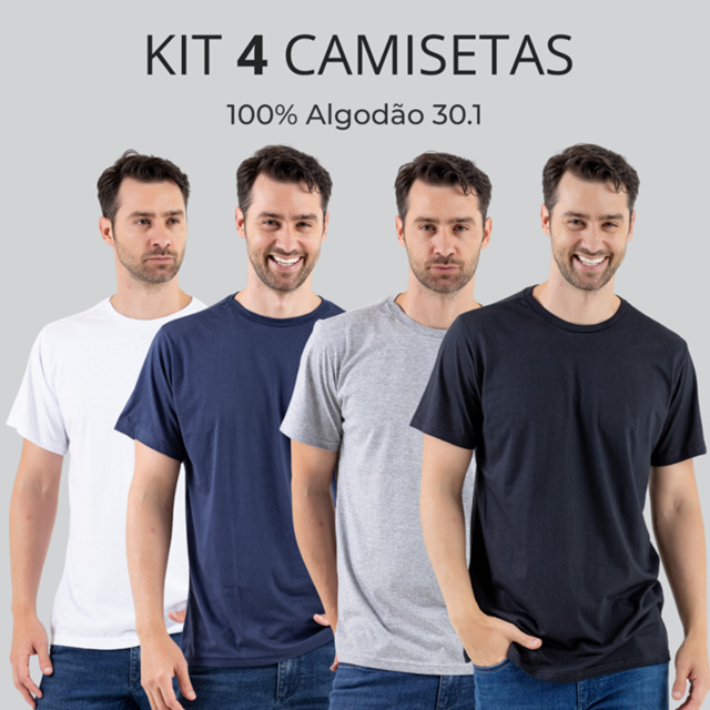 KIT 4 Camiseta Básica Masculina Lisa 100% Algodão 30.1 Manga Curta Acabamento Premium