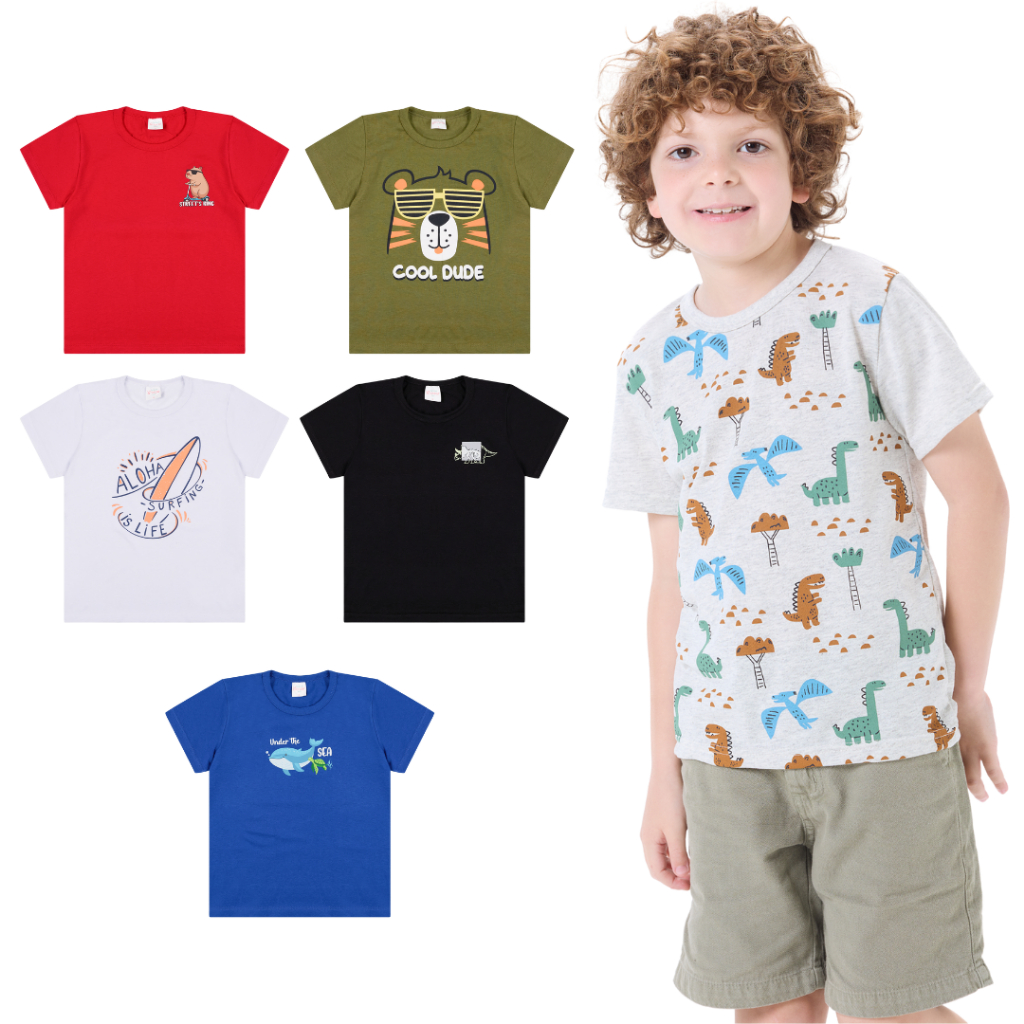 Kit 4 Camisetas Manga Curta Infantil Menino em Meia Malha Estampada 2 ao 8 anos