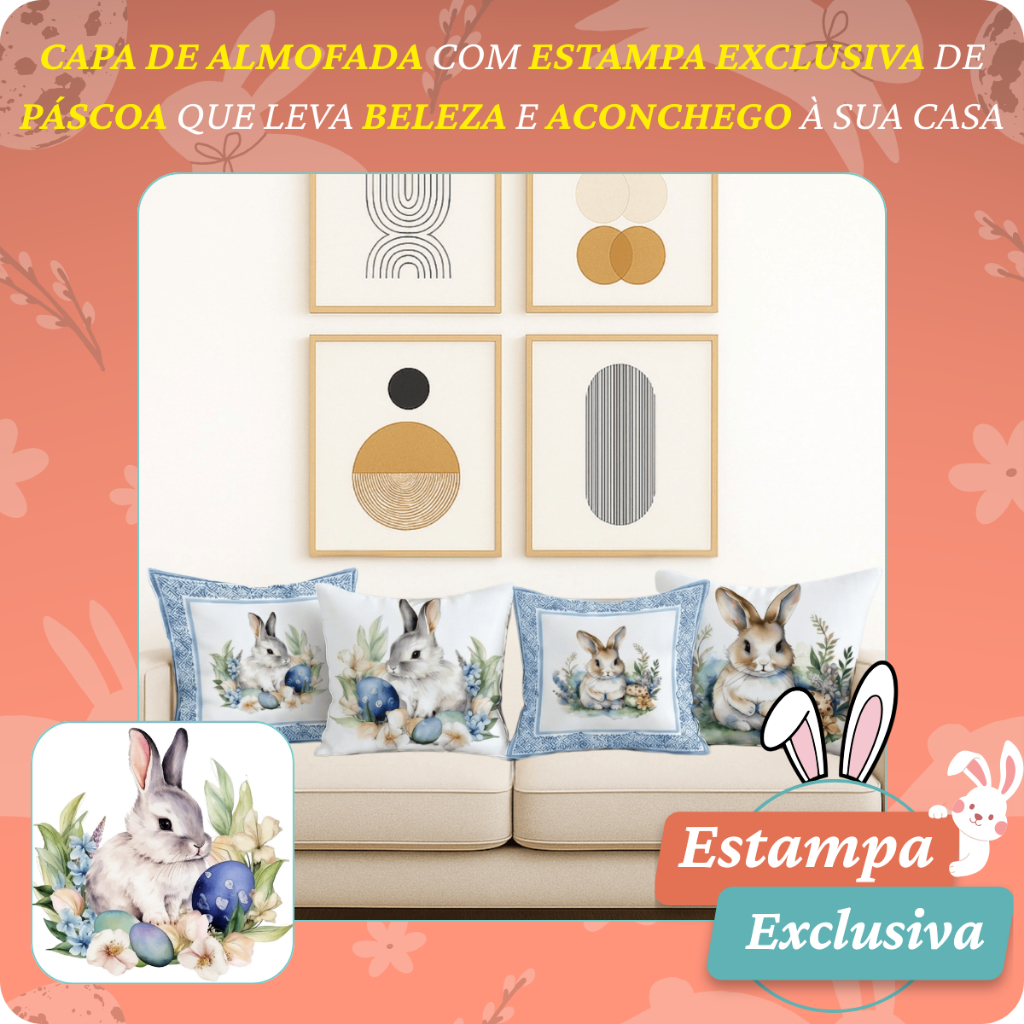 Sua casa merece entrar no clima da Páscoa do jeito mais bonito: decorada, aconchegante e cheia de charme. O Kit com 4 Capas de Almofada Tema Páscoa é ideal para transformar sofá, cama ou poltronas em poucos minutos, deixando o ambiente mais alegre e pronto para receber visitas e fazer fotos lindas. Estampas delicadas com coelhinhos, ovos de Páscoa e elementos temáticos, trazendo aquele toque especial que faz diferença na decoração. 📦 O que vai na embalagem ✅ 04 Capas de Almofada Decorativas Tema Páscoa ❌ NÃO acompanha refil/enchimento 📏 Tamanho Medida de cada capa: 45x45 cm (ou a medida do seu anúncio) ⭐ Por que esse kit vende muito: Decoração completa com 4 capas (fica lindo no sofá) Estampa temática que combina com cozinha, sala e quarto Prático para trocar e renovar o ambiente rápido Tecido resistente e acabamento bem feito Excelente para quem ama casa organizada e decorada 🧼 Cuidados com o produto: Lavar à mão ou na máquina no modo delicado Não usar alvejante Secar à sombra para manter as cores vivas por mais tempo 📌 ATENÇÃO: Produto anunciado é somente o KIT COM 4 CAPAS. Não acompanha refil.