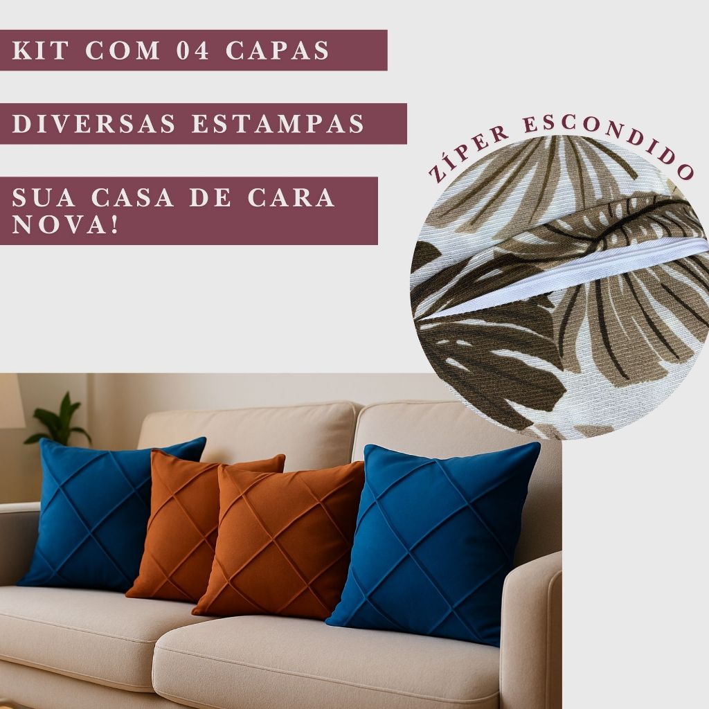 | Kit 4 Capas de Almofada Suede Drapeada 45x45cm Decoração este produto | R$ 49,90 | 29% | 4.9/5 | 18 |