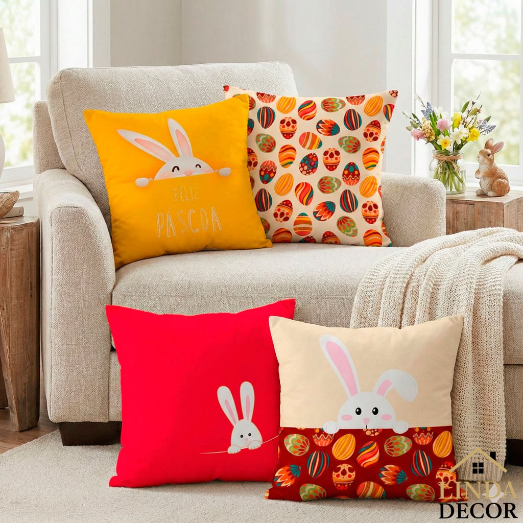 Kit 4 Capas de Almofadas Páscoa 45x45 Oxford e Zíper invisível Estampa Frente e Verso FELIZ PÁSCOA – Linda Decor