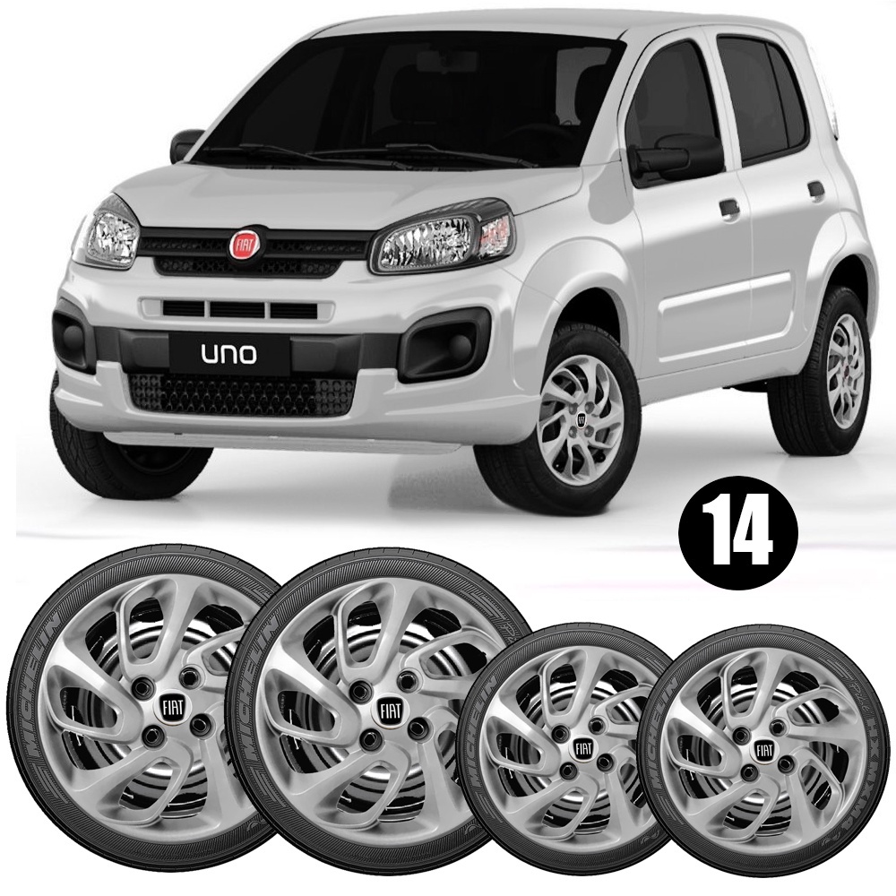 Jogo 4 Calotas Aro 14 Prata Compatível com Uno Attractive 2015 2016 Compatibilidade: - Rodas de Ferro Aro 14 (Todas) Características: - Cor: Prata - Aro: 14 Fixação: - Parafuso (Como as originais) Itens Inclusos: - 4 calotas Aro 14 - 4 Emblemas da Montadora Importante: - O valor é ref. ao kit com 4 calotas + 4 emblemas - Acompanha nota fiscal - Envio Imediato