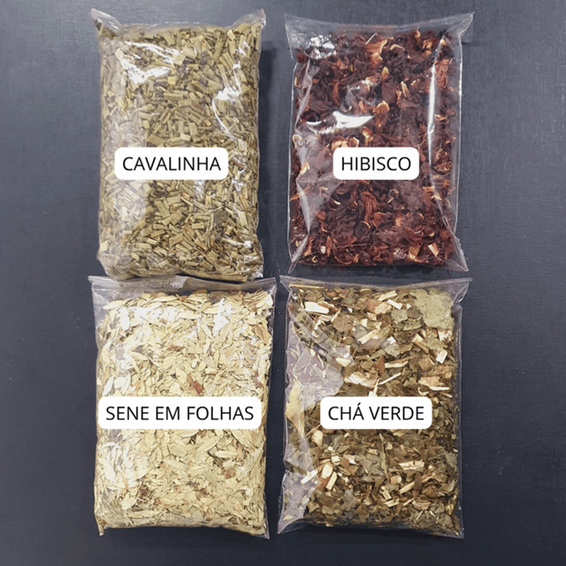 Kit 4 Chás Naturais Desinchá – Cavalinha + Sene em Folhas + Hibisco + Chá Verde – 100g Cada