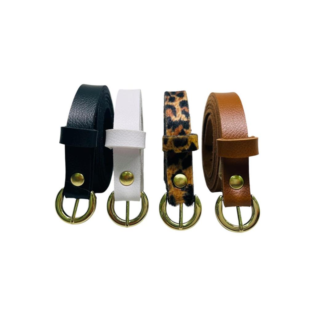 Kit 4 Cintos Feminino Fino Largura 1.5cm Cores, Preto/ Branco/ Caramelo/ Onça Fivela dourada Moda Elegante - Bia