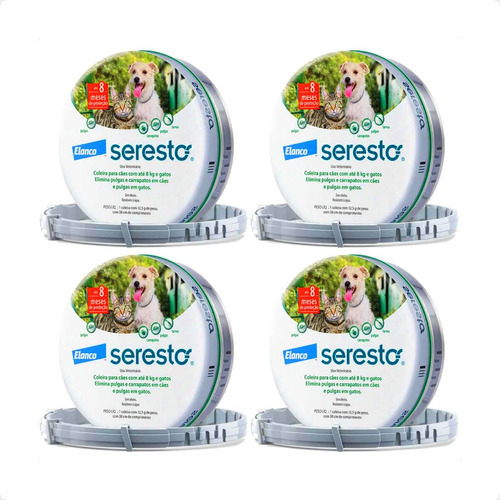 Kit 4 Coleira Antipulgas e Carrapatos Elanco Seresto - Cães e Gatos até 8 Kg