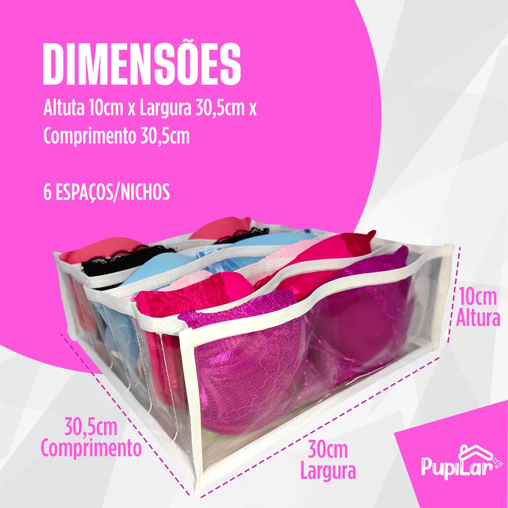 KIT 4 COLMEIAS ORGANIZADORAS DE GAVETAS PARA SUTIÃS (10cm X 30,5cm X 30,5cm) PARA SUTIÃS DO PP AO GG Acabe com o estresse se livre da bagunça, as Colmeias Pupilar vão te ajudar! Com as nossas Colmeias suas roupas ficam super organizadas e faceis de visualizar. Chega de ter que procurar a suas roupas preferidas no fundo das gavetas. As Colmeias Pupilar são fabricadas em um Plástico Cristal Premium transparente, que dão excelente visibilidade na hora de procurar suas roupas. São flexíveis e muito resistentes. ENVIAMOS PARA TODO O BRASIL DESPACHAMOS SEU PEDIDO EM MENOS DE 24 HORAS FICHA TÉCNICA QUANTIDADE DE NICHOS: 6 DIMENSÕES: 10cm Altura X 30,5cm Largura X 30,5cm Comprimento COR DO VIÉS: Branco GARANTIA: 90 DIAS CONTRA DEFEITOS DE FABRICAÇÃO INDICAÇÃO DE USO: Ideal para Organizar Sutiãs dos tamanhos PP ao GG e outras peças com o tamanho similar. DÚVIDAS FREQUENTES: P: Essa Colmeia Sutiã serve para calça jeans? R: Não, a Colmeia recomendada para calça jeans e bermudas é o modelo JEANS(GG) (20x25x40). P: Produto tem garantia? É possível devolver? R: Todos os nossos produtos dispõem de 3 meses de garantia contra defeitos de fabricação. Se tiver alguma dúvida, entre em contato conosco através do chat, será uma satisfação ajudar. Ótimas Compras!