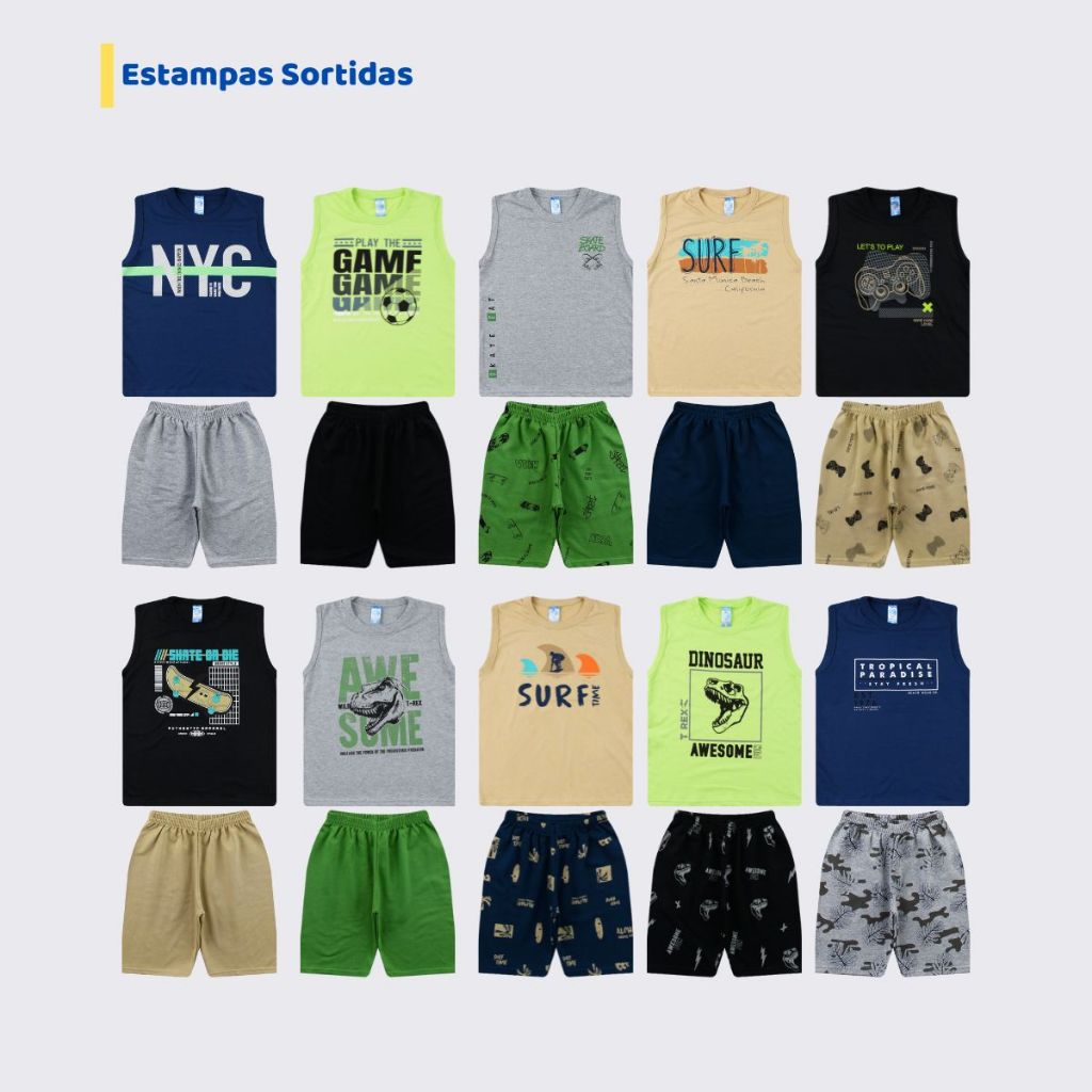 Seja Bem vindo a Joy Infantil! -------------------------------------------------------- ESPECIFICAÇÕES DO KIT: - Quantidade de Peças: 8 Peças (4 Camisetas Regata + 4 Bermudas) - Tamanhos: 10 ao 16 - Composição das Bermudas e Camisetas: Algodão - Tecido Bermuda: Moletinho - Camisetas: Regata -------------------------------------------------------- A TABELA DE MEDIDAS SE ENCONTRAM NAS FOTOS DO ANÚNCIO!!! -------------------------------------------------------- 1 - POSSO ESCOLHER TAMANHOS VARIADOS? R: Só conseguimos enviar um ÚNICO TAMANHO por kit. 2 - POSSO ESCOLHER AS ESTAMPAS? R: As estampas são enviadas de maneira SORTIDA mas temos certeza que você vai amar todas. 3 - QUAL TAMANHO DEVO ESCOLHER? R: Indicamos conferir nossa TABELA DE MEDIDAS que está nas imagens do anuncio pois nela há uma recomendação de tamanho por idade. -------------------------------------------------------- Aproveite agora mesmo essa super oferta! AGRADECEMOS PELA SUA VISITA E AGUARDAMOS A SUA COMPRA.