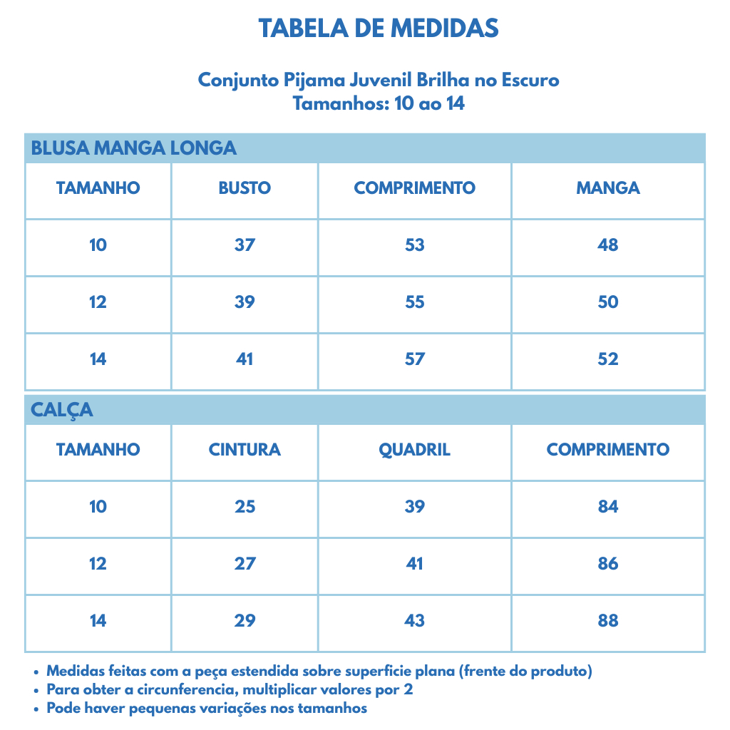 Kit 4 Conjuntos Pijama Longo para Menino, tamanhos 10 ao 14 com Estampas que Brilham no Escuro! Nosso conjunto de Pijama é confeccionado em malha 100% algodão, proporcionando muito conforto e muita diversão com suas estampas que brilham no escuro! Cores Sortidas! Compras realizadas até 11h, são despachadas no mesmo dia! (exceto aos finais de semana) Itens da embalagem: - Contém: 4 Conjuntos de Pijama Longo Especificações dos Produtos: - Medidas: CAMISETA 10: Busto:37cm - Comprimento:53cm - Manga:48cm 12: Busto:39cm - Comprimento:55cm - Manga:50cm 14: Busto:41cm - Comprimento:57cm - Manga:52cm SHORT 10: Cintura:25cm - Quadril:39cm - Comprimento:84cm 12: Cintura:27cm - Quadril:41cm - Comprimento:86cm 14: Cintura:29cm - Quadril:43cm - Comprimento:88cm - Material: 100% Algodão - Produto Fabricado no Brasil Instruções de lavagem: Lavar a mão ou na maquinaNão Usar Alvejante a base de Cloro Proibido usar Secadora Secar Verticalmente e na Sombra Passar em temperatura mínima Avisos Importantes: - As medidas informadas são valores aproximados e podem sofrer alguma variação. - As cores podem sofrer uma pequena variação, dependendo do lote do produto e das configurações do seu computador