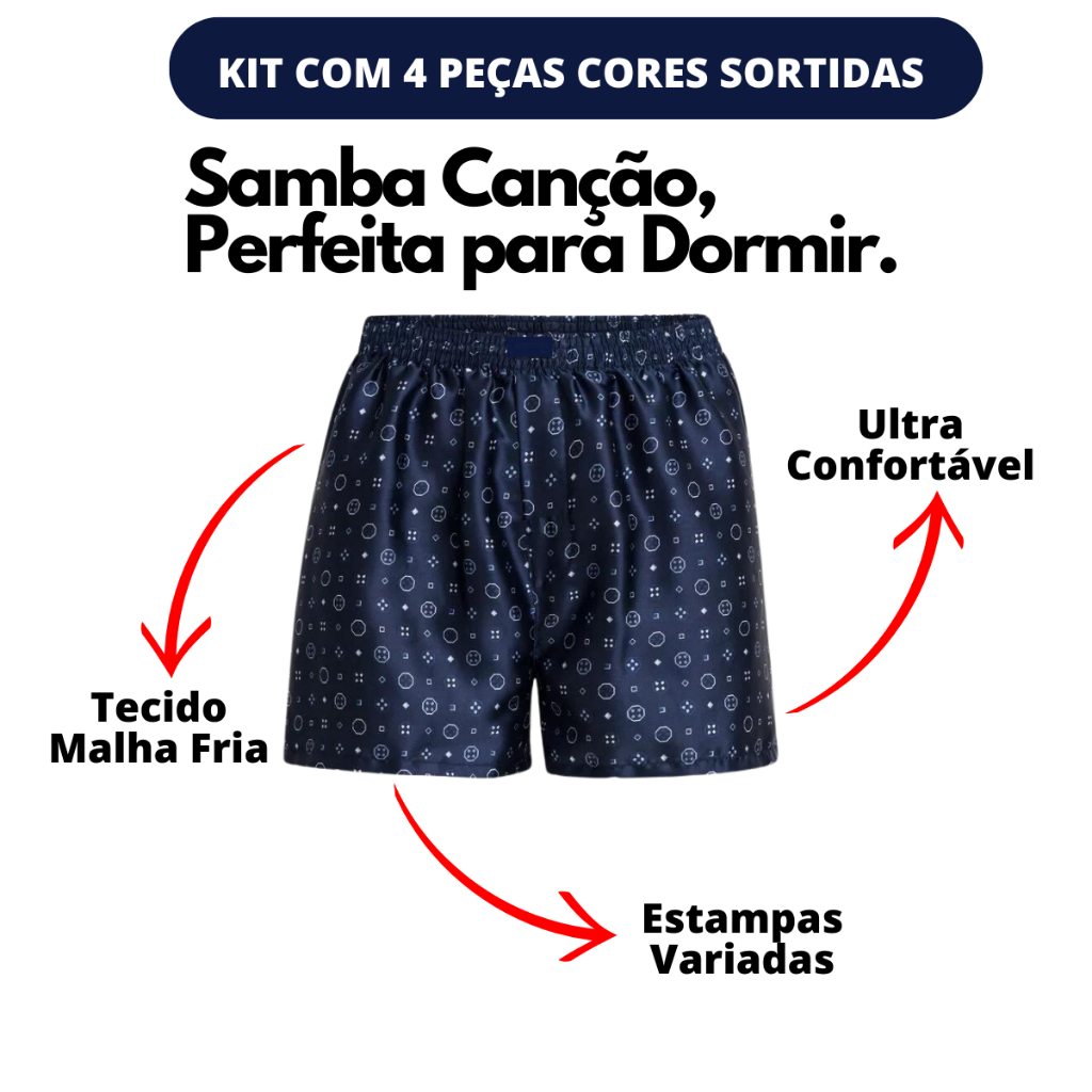 Seja Bem vindo a R.E. Multimarcas, trabalhamos com produtos com qualidade 100% aprovada. Produto 100% original, com garantia e nota fiscal. ## Kit com 4 Cuecas Samba Canção Cetim ## ### CARACTERÍSTICAS ### » Tecido 100% Poliéster » Ventilação estratégica em zonas críticas de suor, impedindo o aquecimento e o incômodo. » Tecido com tecnologia que impede a proliferação de microrganismos. ### COMPOSIÇÃO ### 100% Poliéster ### TABELA DE TAMANHO ### P: 34/36 M: 38/40 G: 42/44 GG: 46/48 ### ATENÇÃO PARA AS CORES ### Não é possível escolher as cores, o kit com 4 cuecas é enviado com cores sortidas, podendo variar entre: Preto, Azul Marinho, Azul Royal, Bordô, Cinza Escuro ### OBSERVAÇÕES ### » Não é possível comprar um tamanho e solicitar outro no campo de (MENSAGENS); » Verifique antes de finalizar a compra que você escolheu o TAMANHO correto. » Em compra de Kits as cores são enviadas CONFORME A DISPONIBILIDADE DO ESTOQUE, sem a possibilidade de escolha. ### ESTOQUE DISPONÍVEL PARA ENVIO IMEDIATO ###
