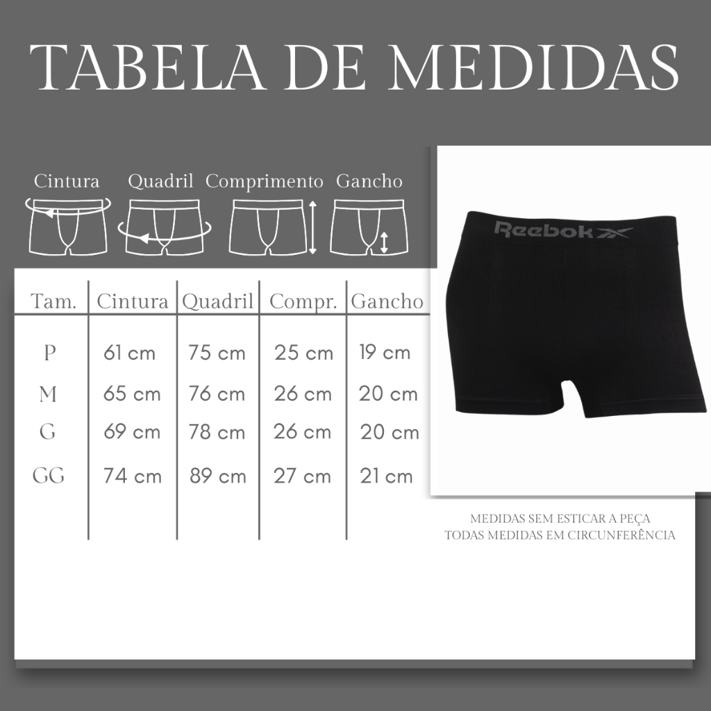 DETALHES DO PRODUTO: - Modelagem Boxer - Sem Costura - Cós Largo - Com Logo Reebok - Toque Suave. TABELA DE MEDIDAS: (Medidas sem esticar / Medidas em circunferência) P (36/38): Cintura: 61cm / Quadril: 75cm / Comprimento: 25cm / Gancho: 19cm M (40/42): Cintura: 65cm / Quadril: 76cm / Comprimento: 26cm / Gancho: 20cm G (44/46): Cintura: 69cm / Quadril: 78cm / Comprimento: 26cm / Gancho: 20cm GG (48/50): Cintura: 74cm / Quadril: 89cm / Comprimento: 27cm / Gancho: 21cm COMPOSIÇÃO: 93,89% Poliéster, 6,11% Elastano - A Cueca Boxer Reebok e confeccionada em tecido de fibras sintéticas com poliéster e elastano, proporcionando toque macio, elasticidade e excelente adaptação ao corpo. Para oferecer máximo conforto, ajuste perfeito e liberdade de movimento no uso diário - A tecnologia seamless (sem costura) elimina pontos de atrito, evitando irritações e garantindo um vestir suave e confortável ao longo do dia. - Seu cós largo oferece sustentação segura sem apertar, além de contar com o logo Reebok, que agrega estilo esportivo e autenticidade à peça. - Com design liso e discreto, essa cueca boxer é ideal para quem busca praticidade, conforto e durabilidade, sendo perfeita para o dia a dia, trabalho ou atividades que exigem mobilidade e bem-estar contínuo. INSTRUÇÕES PARA AUMENTAR A DURABILIDADE DA PEÇA: - Não lavar a seco. Lavagem a mão com sabão neutro. - Não alvejar, não esfregue e não torça. - Não utilizar alvejante ou produtos a base de cloro. - Não utilizar secadora. Secagem em varal, preferência à sombra. - Não recomendamos passar ferro, e nem a vapor. - Permite lavagem profissional a úmido (wet cleaning), garantindo melhor conservação do tecido. PERGUNTAS FREQUENTES: O produto vem igual ao da foto? R: Sim, garantimos que o produto será idêntico à imagem, com fotos tiradas com cuidado. Qual tamanho fica bom para mim? R: Consulte nossa tabela de medidas na descrição do produto ou nas imagens para escolher o tamanho adequado. Vocês enviam no mesmo dia? R: Sim, enviamos pedidos no mesmo dia se realizados antes do horário de corte; pedidos feitos depois serão enviados no próximo dia útil. EXPOSIÇÃO PAULISTA - NOSSA FAMÍLIA VESTE A SUA! Somos uma empresa familiar com mais de 50 anos de tradição na confecção de roupas infantis e adultas no Paraná. Nosso compromisso é oferecer produtos de qualidade, acessíveis e atuais, sempre com foco na satisfação de nossos clientes. SKU: 241541