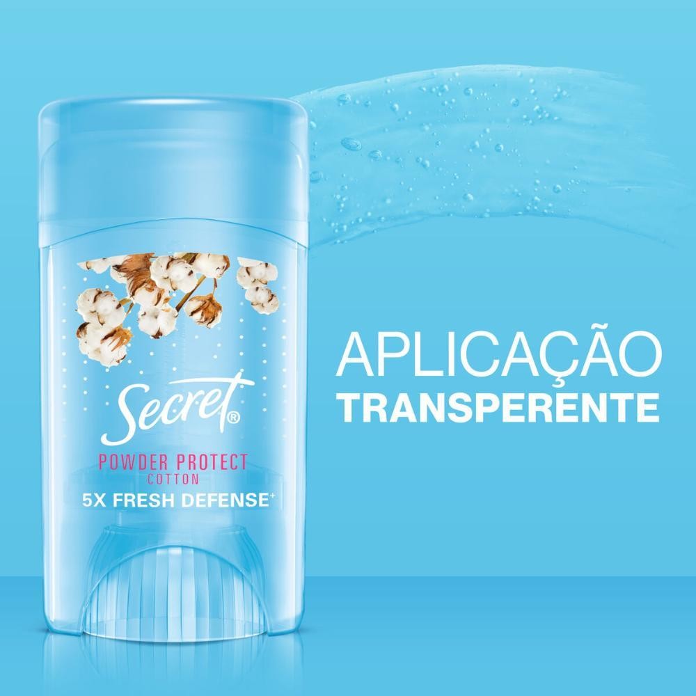 O Kit Contém: 4 Desodorante em Gel Secret Algodão com 45g cada. "Da Um Check Wow, Você vai amar!O Desodorante Secret Gel feminino Proteção de algodão protege a sua pele contra o suor e o mau cheiro nas axilas deixando-a suave e macia. Com seu formato desodorante em gel, proporciona uma proteção duradoura desde o primeiro uso. Por ser um desodorante em gel invisivel não deixa manchas brancas nem resíduos nas roupas. Além disso, o seu suave aroma de algodão lhe proporcionará uma sensação de frescor durante todo o dia.Esse desodorante antitranspirante em gel blinda uma proteção completa que se adapta à sua rotina, pois, controla o suor provocado pelo calor, pelo estresse e por atividades físicas. Além disso, Secret é uma marca livre de crueldade animal certificada pela PETA. Para usar o Desodorante antitranspirante Secret Gel Proteção de algodão, remova o selo de segurança, use de 2-3 clicks por axila, e aplique diariamente apenas na região das axilas, não esquecendo de manter o frasco bem fechado após o uso.Desde 1956 Secret apoia as mulheres a demonstrarem o melhor de si, com uma hidratação e proteção contra o suor e odor nas axilas que contribuem com a confiança que elas necessitam para assumir qualquer desafio. • Protege a sua pele contra o suor e o mau cheiro nas axilas deixando-as suave e macia • Sua textura em gel invisivel proporciona uma proteção duradoura desde o primeiro uso sem deixar manchas brancas nem resíduos na aplicação • Possui um suave aroma de algodão que mantém uma sensação de frescor durante todo o dia • Controla o suor provocado pelo calor, pelo estresse e por atividades físicas. Além de ser é uma marca livre de crueldade animal certificada pela PETA • Fácil de aplicar, basta aplicar 2-3 clicks diretamente apenas na região de cada uma das axilas