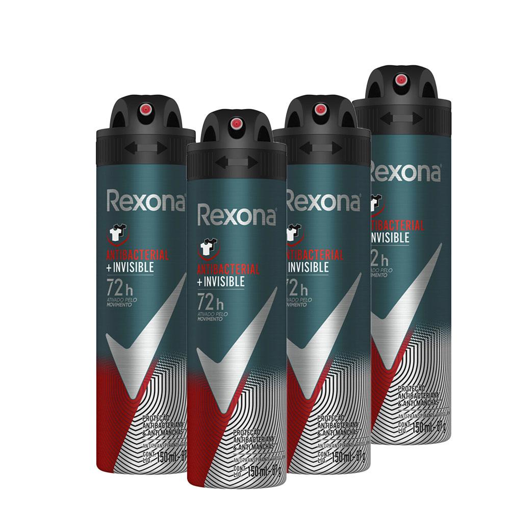 Kit 4 Desodorantes Rexona Men Motionsense Antitranspirante Aerossol Antibacterial e Invisible 150ml Contém: 4 Desodorantes Rexona Men Motionsense Antitranspirante Aerossol Antibacterial e Invisible 150ml Cada * Compre produtos Rexona.