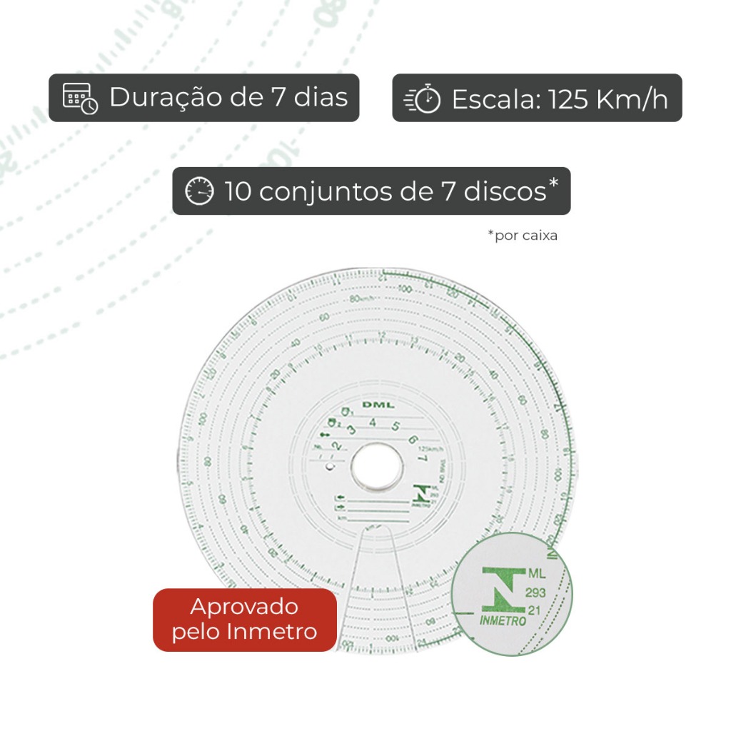 DISCO TACÓGRAFO SEMANAL 7D/180KM 20X20 - DML Os Discos Diagramas para Tacógrafos DML são responsáveis pelo registro da velocidade, distância percorrida e tempo de movimentação do veículo, com um armazenamento altamente confiável, uma vez que impossibilita a alteração dos dados registrados. Sua utilização é obrigatória para: ✅ Veículos de transporte ✅ Condução de escolares ou de passageiros com mais de dez lugares ✅ Veículos de carga com capacidade máxima de tração superior a 19 T ou com peso bruto total superior a 4.536 kg, quando produzidos a partir de 1º de janeiro de 1999. A manipulação e a alteração dos dados registrados são impossíveis, o que garante qualidade e confiabilidade; 🔰 São testados e homologados pelo Inmetro 🔰 • DML 001 - Disco Diagrama 7 dias • Escala: 180 Km/h • Divisões: 20×20 Km/h • Aplicação: Disco semanal para tacógrafo 180 Km/h • Caixa individual: 1 caixa com 10 discos de 7 dias As principais vantagens dos Discos DML são: ✅ Possuem alta resistência química, o que garante a durabilidade das gravações das grafias em caso de contato com água, óleo ou graxa; ○○○○○○○○○○○○○○○○○○○○○○○○○○○○○○○○○○○○○○○○○○○○○○○○ A Ninja Parts, fundada em 2016, é um e-commerce referência nacional em peças e acessórios automotivos. Oferecemos as melhores marcas com qualidade e envio rápido, priorizando a satisfação do cliente e um excelente atendimento. Garantia • 90 dias a partir da data da compra; • Garantia válida apenas para defeitos de fábrica- Não é coberto mau uso, má instalação, quebra ou adaptações que alterem características originais do produto; Trocas e Devoluções • Importante que todos os itens sejam enviados nas embalagens originais de forma segura; • Caso o produto retorne danificado, os custos ficarão sob responsabilidade do cliente; Recomendação • A instalação seve ser realizada por um profissional de sua confiança; Compra Garantida • Transação Segura; • Estorno automático em caso de imprevistos; • Acompanha nota fiscal; • Produtos a pronta entrega.