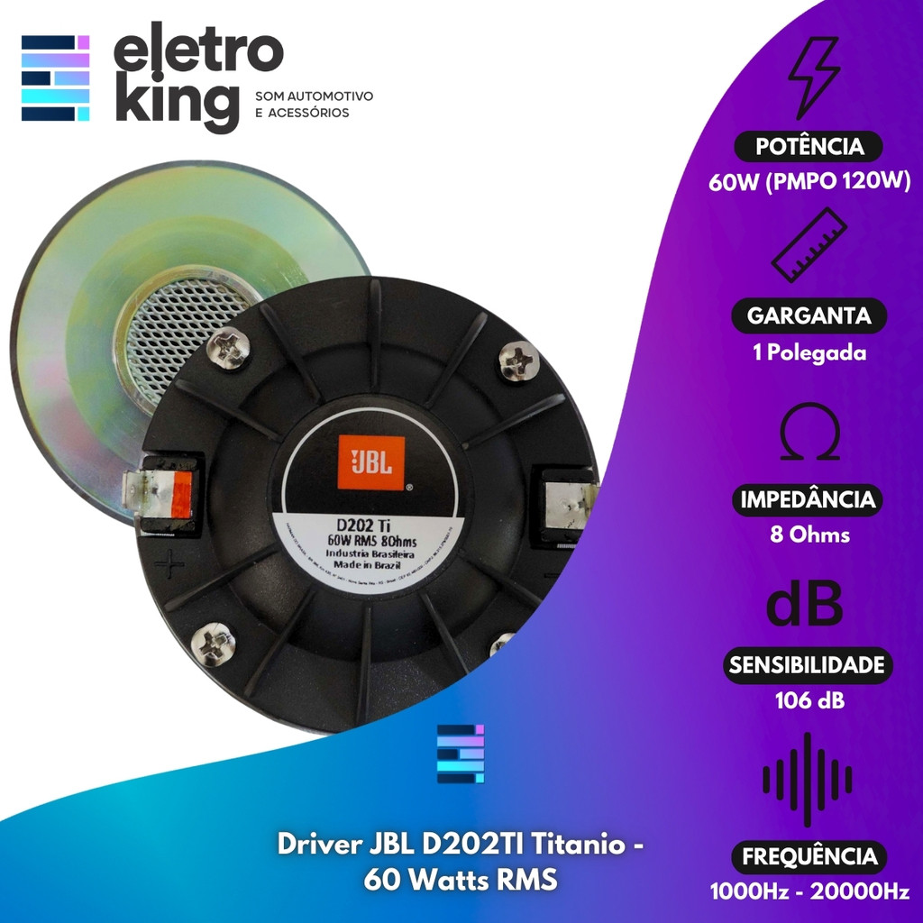 Seja bem-vindo a Eletroking, leia atentamente a descrição do produto abaixo antes da compra, qualquer dúvida, nos acione no campo de perguntas do anúncio. Kit 4 Driver JBL D202TI Titânio 60 Watts RMS + 4 Guia de Ondas O Driver de Titânio 60W RMS com Guia de Ondas é a escolha ideal para quem busca alta definição e durabilidade sonora. Com 60 Watts RMS e uma resposta de frequência estendida, esse driver proporciona agudos precisos e claros, perfeitos para sistemas automotivos e profissionais. A construção em titânio garante maior resistência e durabilidade, enquanto o Guia de Ondas com design exclusivo assegura uma propagação de som uniforme e limpa. Ideal para quem busca uma experiência sonora elevada, com clareza e confiabilidade em todos os detalhes. Especificações Técnicas: Driver JBL D202TI Titanio - 60 Watts RMS • Marca: JBL • Modelo: D202 TI • Diâmetro nominal da bobina (mm): 44 • Impedância: 8 Ohms • Diâmetro da garganta: 1 • Fixação: Rosca • Resposta de Frequência (Hz): 1000Hz - 20000Hz • Material do Diafragma: Titânio • Material do Ferrite: Bário • Potência Real Total: 60 Watts Rms • Potência de Pico Total (PMPO): 120 Watts • Sensibilidade: 106 dB • Peso Aproximado: 930g Guia De Onda Bomber P Driver Selenium Hinor Titanio Titanium • Resposta de Frequência: 700 - 6.300 Hz • Sensibilidade: 105 dB SPL • Diâmetro da Garganta: 25 mm (1 ) • Material: Plástico • Cobertura Angular: 45° x 10° • Conexão Corneta x Driver: Rosqueado 1 3/8” – 18FPP • Injetada em Policarbonato de Alta Resistência • Rosca de 1 (25mm) • Chicanes Perfeitas para Formar onda Plana • Dimensões Aproximadas: 20,8x17,2x25,9cm (LxAxC) Conteúdo da Embalagem: • 04 Driver JBL D202TI Titanio - 60 Watts RMS • 04 Corneta Bomber Guia de Ondas Preta • Manual e Certificado de Garantia. Importante: • Garantia de 273 Dias. • Valor do Kit. • Todos os Nossos Produtos São Novos, Originais e Acompanham Nota Fiscal. • A Eletroking recomenda que a instalação seja feita por profissional especializado e não se responsabiliza pelo mau uso do produto.