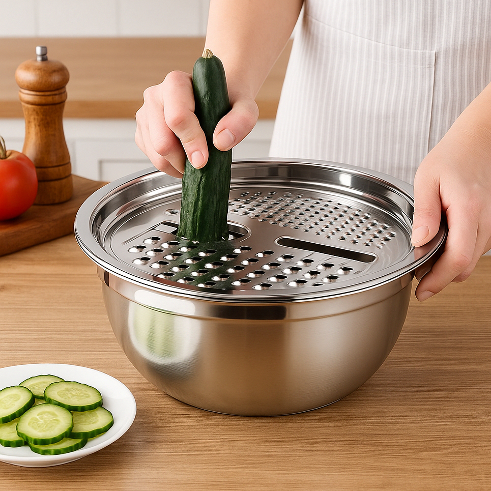 Kit 4 em 1 Bacia Ralador Fatiador Inox Tigela Saladeira Bowl Vasilha Cozinha Prática