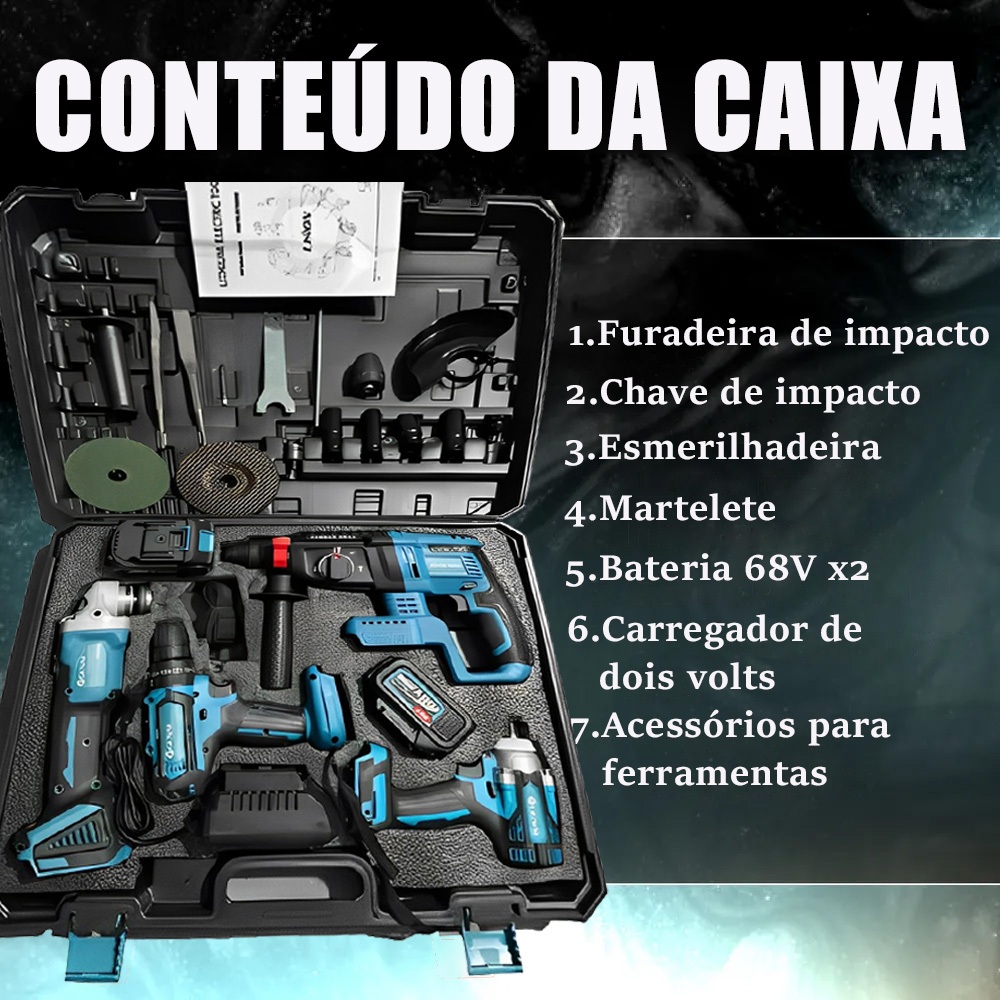 Esta é uma ferramenta de motor sem escova ! O Kit Multiferramentas 4 em 1 a Bateria 68V é a solução completa e versátil para profissionais e entusiastas de bricolagem que buscam desempenho e praticidade em uma única compra. Este kit inclui uma furadeira de impacto, uma chave de impacto, um martelete e uma esmerilhadeira, todas alimentadas por uma potente bateria de 68V, garantindo uma performance consistente e duradoura em diversas aplicações. Com um design ergonômico e robusto, cada ferramenta foi projetada para oferecer máxima eficiência e conforto durante o uso prolongado, sendo ideal para trabalhos em ambientes difíceis ou que exijam alta mobilidade. As ferramentas possuem controle de velocidade variável, possibilitando ajustes precisos conforme o tipo de material e tarefa. Além disso, a tecnologia de baterias recarregáveis de íon-lítio proporciona carregamento rápido e maior durabilidade da carga, assegurando que o usuário tenha energia suficiente para concluir qualquer projeto sem interrupções. O conjunto vem em uma maleta resistente, facilitando o transporte e armazenamento seguro de todas as peças. Informações técnicas: * Voltagem da bateria: 68V. * Tipo de bateria: Íon-lítio recarregável. * Velocidade variável: Sim. * Design ergonômico: Sim. * Funções incluídas: Furadeira de impacto, chave de impacto, martelete e esmerilhadeira. Chave de impacto: Diametro do parafuso: 6-26m Velocidade sem carga: 3200 Frequencia de impacto:0-3800 Capacidade da bateria.2000MAH Torque maximo: 320NM Esmerilhadeira: Velocidade sem carga:10000RPM Eixo principal: 10mm Diametro do furo: M16 Diametro do disco: Ф125mm Furadeira de impacto: DiÃmetro maximo do mandril: Ф10mm Torque maximo: 35N.m Velocidade sem carga: alta velocidade: 0-1350r' min Baixa velocidade: 0-350r/ min Martelo: Tensao: 68v 5.0Ah Li-ion Regulacao de torque:18+1 Diametro do mandril: Ф10mm Velocidade sem carga: 0-350/0-1250rpm Conteúdo da embalagem: * 1x furadeira de impacto. * 1x chave de impacto. * 1x martelete. * 1x esmerilhadeira. * 1x chave de aperto. * 2x baterias 68V. * 1x carregador bivolt. * 13x acessórios para ferramentas