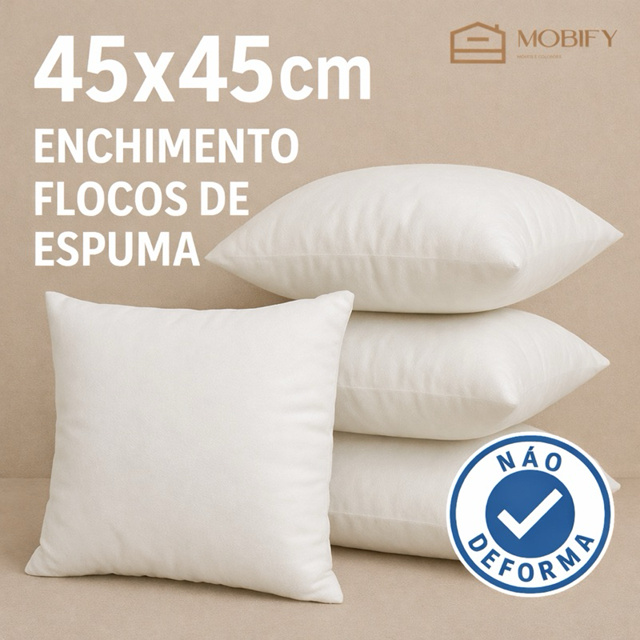 Enchimento para Almofada 45x45cm – Mobify ✨ Transforme suas capas de almofada em peças ainda mais aconchegantes com o enchimento Mobify, produzido com flocos de espuma de alta qualidade. Macio, leve e hipoalergênico, garante conforto e durabilidade para o dia a dia. ✅ Medidas: 45x45cm ✅ Enchimento: Flocos de Espuma ✅ Não deforma – mantém o volume por muito mais tempo ✅ Toque macio e confortável ✅ Ideal para capas decorativas 💡 Perfeito para sofás, camas, poltronas ou qualquer ambiente que precise de um toque de aconchego. 📦 Conteúdo da embalagem: 4 refil enchimento para almofada
