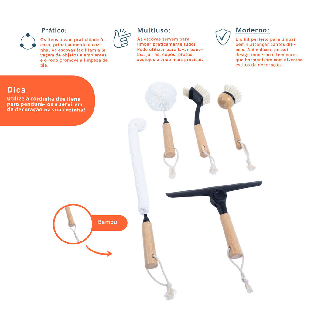 Conheça o Kit com 4 escovas de limpeza e rodo de pia preto da OIKOS. Prático, multiuso e moderno, é o kit perfeito para limpar bem e alcançar cantos difíceis. Além disso, possui design moderno e tem cores que harmonizam com diversos estilos de decoração. As escovas facilitam a lavagem de objetos e ambientes, servem para lavar panelas, jarras, copos, pratos, azulejos e onde mais precisar. Já o rodo promove a limpeza da pia, ajudando a retirar o excesso de água. As escovas são de bambu, plástico e PET. O rodo é de bambu e plástico. Para limpar, basta lavar em água corrente com sabão neutro e deixar secar em local arejado. Leve qualidade e modernidade para sua casa! O kit contém: Escova de limpeza duo com cabo de bambu Escova de limpeza redonda com cabo longo de bambu Escova de limpeza flexível para jarras com cabo de bambu Escova para lavar copos com cabo de bambu Rodo de pia dobrável com cabo de bambu