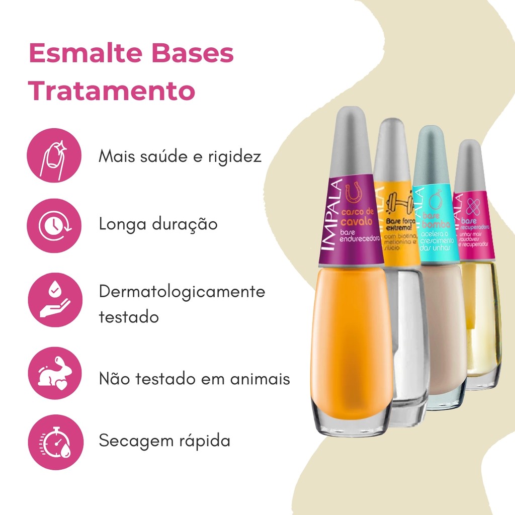O Kit 4 Esmalte Base Tratamento Endurecedor Unhas Fracas Impala foi desenvolvido para quem sofre com unhas quebradiças e frágeis, oferecendo proteção, fortalecimento e saúde para as unhas desde a primeira aplicação. Ideal para incluir na rotina de cuidados ou antes da esmaltação, esse kit vai transformar o visual e a resistência das suas unhas! Sobre o produto: - Marca: Impala. - Conteúdo: 7,5 ml. - Hidrolisado de queratina. - D-Pantenol. - óleo de Argan. - Bomba de Nanoativos - Secagem rápida. - Não testado em animais. - Dermatologicamente testado. O que tem: - 1 Esmalte Impala Base Casco De Cavalo Fortalecedora. - 1 Esmalte Impala Base Força Extrema Tratamento De Unhas Fracas. - 1 Esmalte Impala Base De Unhas Bomba Acelerador De Crescimento. - 1 Esmalte Impala Base Recuperadora Tratamento Para Unhas Fraca. O que faz: - Endurece as unhas frágeis, reduz a quebra, melhora a aparência e prepara a unha para a esmaltação. Indicado para: - Quem tem unhas quebradiças, finas, frágeis ou em processo de recuperação e quer um cuidado diário eficaz. Modo de uso: - Agite bem antes de usar. - Aplique a Base sobre as unhas. - Comece pelo centro e, em seguida, preencha as laterais. - Se desejar realize a esmaltação. Aguarde a secagem. Precauções de uso: - Não expor ao calor/luz solar, não ingerir. - Manter fora do alcance das crianças. - Usar somente em adultos, não usar sobre a pele irritada ou lesionada. - Em caso de irritação, suspender o uso e procurar orientação médica. Com secagem rápida, fácil aplicação e resultado visível com o uso contínuo, o Kit Impala é o aliado perfeito para deixar suas unhas mais bonitas e resistentes. Garanta já o seu e diga adeus às unhas fracas! Surgiu alguma dúvida? Entre em contato com a gente! Boas Compras :)
