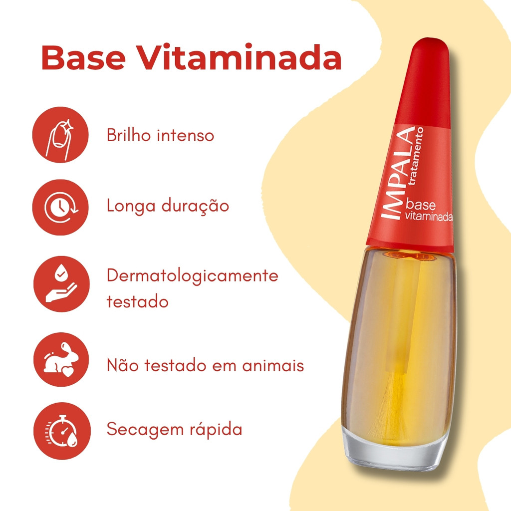 Unhas fortes, protegidas e com aparência saudável começam com o Kit Esmaltes Impala Tratamento Base Vitaminada! Se você busca um cuidado extra para suas unhas antes da esmaltação, essa base é a escolha certa. Ideal para quem quer unir beleza e tratamento em um só produto. Por que escolher o Kit Esmaltes Impala Tratamento Base Vitaminada? Porque suas unhas merecem mais do que cor, merecem saúde e proteção desde a primeira camada! Sobre o produto: - Marca: Impala. - Linha: Tratamento. - Conteúdo: 7,5 ml. - Brilho intenso. - Longa duração. - Secagem rápida. - Não testado em animais. - Dermatologicamente testado. - D-Pantenol. - Vitamina E. O que faz: - Cuidados básicos e diários para suas unhas. - Auxilia na textura, brilho, finalização, nutrição e fortalecimento das unhas. - Unhas sempre lindas e cheias de saúde. Indicado para: - Profissionais de manicure e pedicure. - Cuidados pessoais em Casa. Modo de uso: - Agite bem antes de usar. - Aplique a Base sobre as unhas. - Comece pelo centro e, em seguida, preencha as laterais. - Se desejar realize a esmaltação e aguarde a secagem. Precauções de uso: - Não expor ao calor/luz solar, não ingerir. - Manter fora do alcance das crianças. - Usar somente em adultos, não usar sobre a pele irritada ou lesionada. - Em caso de irritação, suspender o uso e procurar orientação médica. Com o Kit Impala Base Vitaminada, você garante cuidado diário, unhas mais resistentes e uma esmaltação mais duradoura. Dê o primeiro passo para unhas impecáveis. Leve o seu agora mesmo e sinta a diferença na primeira aplicação! Surgiu alguma dúvida? Entre em contato com a gente! Boas Compras :)