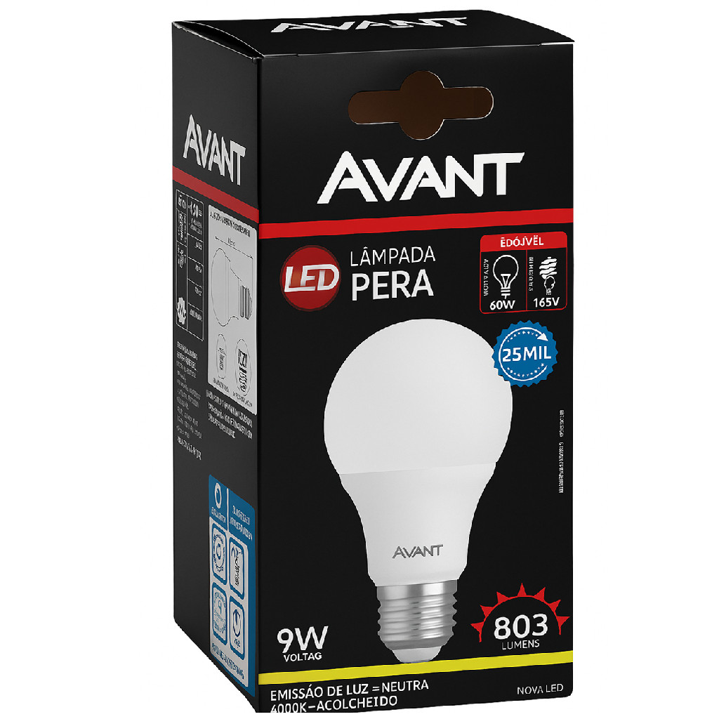 Lampada Led Bulbo Pera 9w Luz Neutra 4000K E27 Bivolt Ilumine seus ambientes com eficiência e conforto visual com a Lâmpada LED 9W E27 Luz Neutra 4000K da Avant . Com design moderno, acabamento fosco e base padrão E27, essa lâmpada oferece luz neutra (4000K), ideal para áreas que exigem equilíbrio entre aconchego e concentração, como salas, escritórios, corredores e cozinhas. Conta com fluxo luminoso de 803 lúmens, amplo ângulo de abertura de 200° e eficiência luminosa de 89 lm/W, proporcionando iluminação uniforme e econômica. Fabricada com base de alumínio e corpo em plástico resistente, é leve (apenas 22g), compacta (60x108mm) e indicada exclusivamente para uso interno. Com vida útil de até 25.000 horas, opera em tensão bivolt (100V a 240V), com baixo consumo de energia e fator de potência de 0,70. Além disso, não permite dimerização, garantindo maior estabilidade e durabilidade. Características Técnicas: Potência: 9W Emissão de luz: NEUTRA 4000K Base: E27 Estética: Acabamento Fosco Tensão nominal: 100V - 240V BIVOLT Corrente nominal: 127V - 78mA / 220V - 53mA Frequência: 50-60Hz Vida Útil (L70): 25000h Fluxo Luminoso: 803lm Eficiência Luminosa: 89 lm/W Ângulo de Abertura: 200 Fator de Potência: 0.70 IRC: 80 Índice de Proteção: IP20 Uso Interno Temperatura Ambiente: -20°C a 40°C Material: Plástico Dimensões: 60mm x 108mm Material: Base em Alumínio, corpo e bulbo em plástico Peso: 22g NÃO PERMITE DIMERIZAÇÃO