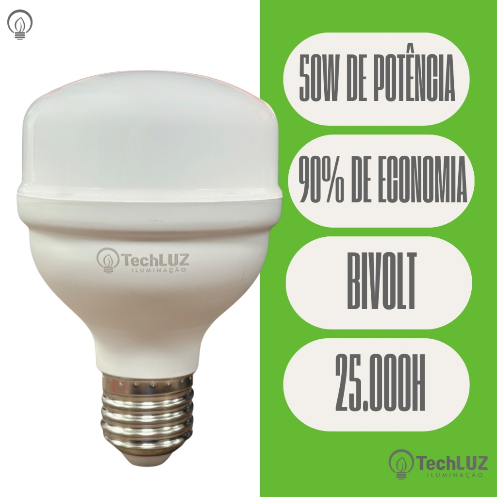 NOVO MODELO! NOVO MODELO! NOVO MODELO! NOVO MODELO! NOVO MODELO! NOVO MODELO! NOVO MODELO! NOVO MODELO! **IMAGEM ILUSTRATIVA** A lâmpada LED Bulbo TechLuz tem máxima economia de energia , lâmpada de iluminação de alta qualidade. Ela é projetada para substituir as lâmpadas incandescentes convencionais, oferecendo uma opção mais eficiente e econômica. As lâmpadas LED proporcionam economia de 90%. Uma opção sustentável que garante que o valor da sua conta de energia elétrica seja mais baixo! Além disso, essa lâmpada tem uma alta eficiência luminosa, o que significa que produz uma quantidade maior de luz com menos energia. Ela é construída com materiais duráveis e de alta resistência, garantindo uma vida útil longa e confiável. *DIMENSÃO: 10 X 7 CARACTERÍSTICAS: Potência: 50w Tensão: Bivolt (serve para 110v e 220v) Base: E27 Frequência Nominal: 60Hz Fluxo Luminoso: 4250Lm Eficiência Luminosa: 85lm/W Fator Potência: >0.92 Cor: 6500K (Branco Frio) Vida Útil: até 25.000h IRC: 80 Não Dimerizável 90% de economia *DIMENSÃO: 10 X 7
