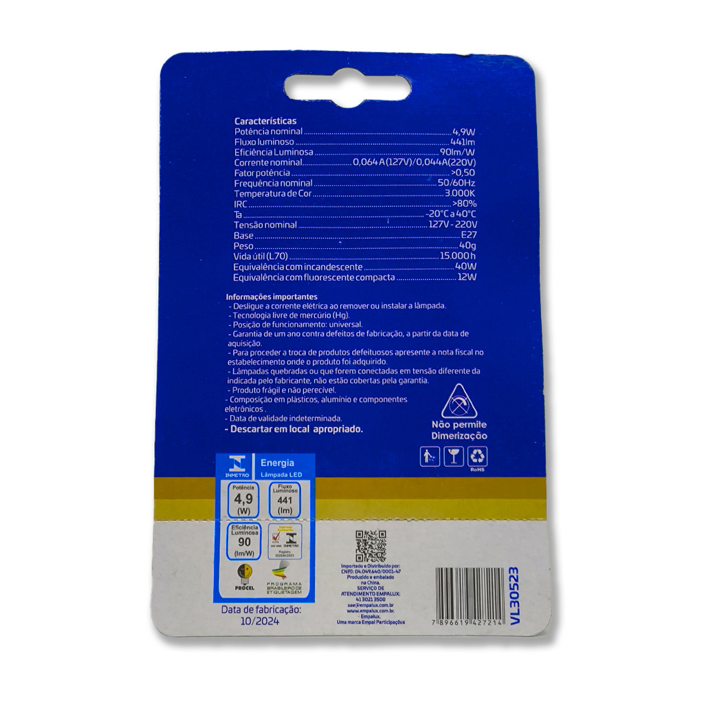 Lâmpada Vela LED Leitosa 4.9W Bivolt 3000K – VL30523 A lâmpada vela LED leitosa é a escolha ideal para quem busca iluminação decorativa com eficiência energética. Com seu formato elegante e acabamento fosco, ela combina perfeitamente com lustres, pendentes e luminárias decorativas, criando um ambiente acolhedor com sua luz quente de 3000K. Características Técnicas: Código: VL30523 Tensão: Bivolt (110V/220V) Potência: 4.9W Fluxo Luminoso: 441 lúmens Temperatura de Cor: 3000K (luz amarela quente) IRC (Índice de Reprodução de Cor): >80 Base: E27 Selo Inmetro: Sim Vida útil estimada: 15.000 horas Garantia: 1 ano Dimensões: Comprimento: 105 mm Diâmetro: 37 mm