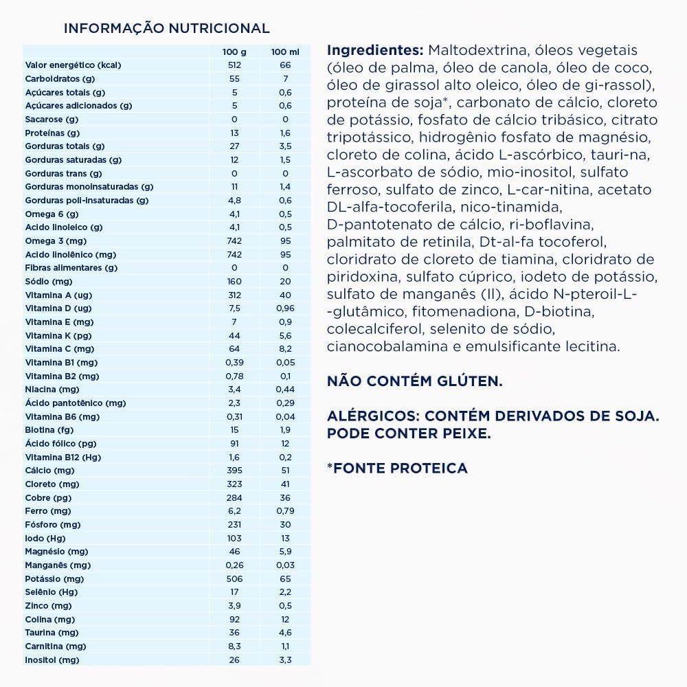 Validade 10/05/2027 -Aptanutri, a evolução da nutrição a partir de 1 ano! Aptanutri Soja 3 é uma fórmula infantil da Danone, formulada especificamente para atender às necessidades nutricionais de crianças a partir de 1 ano, especialmente para aquelas com restrições alimentares como a alergia à proteína do leite de vaca (APLV) IgE mediada, intolerância à lactose ou como opção vegetariana para famílias que preferem uma nutrição plant-based. Esta fórmula a base de soja é a primeira e única da categoria, não contendo fontes de proteína animal, possuindo vitaminas e minerais ajustados para a faixa etária, apoiando as crianças nesta fase importante do desenvolvimento. [box] O MINISTÉRIO DA SAÚDE INFORMA: O ALEITAMENTO MATERNO EVITA INFECÇÕES E ALERGIAS E É RECOMENDADO ATÉ OS 2 (DOIS) ANOS DE IDADE OU MAIS O PRODUTO MENCIONADO NÃO CONTÉM GLÚTEN. Consulte sempre seu médico e/ou nutricionista. Ingredientes Maltodextrina, óleos vegetais (óleo de palma, óleo de canola, óleo de coco, óleo de girassol alto oleico, óleo de girassol), proteína de soja*, carbonato de cálcio, cloreto de potássio, fosfato de cálcio tribásico, citrato tripotássico, hidrogênio fosfato de magnésio, cloreto de colina, ácido L-ascórbico, taurina, L-ascorbato de sódio, mio-inositol, sulfato ferroso, sulfato de zinco, L-carnitina, acetato DL-alfa-tocoferila, nicotinamida, D-pantotenato de cálcio, riboflavina, palmitato de retinila, DL-alfa tocoferol, cloridrato de cloreto de tiamina, cloridrato de piridoxina, sulfato cúprico, iodeto de potássio, sulfato de manganês (II), ácido N-pteroil-L-glutâmico, fitomenadiona, D-biotina, colecalciferol, selenito de sódio, cianocobalamina e emulsificante lecitina.