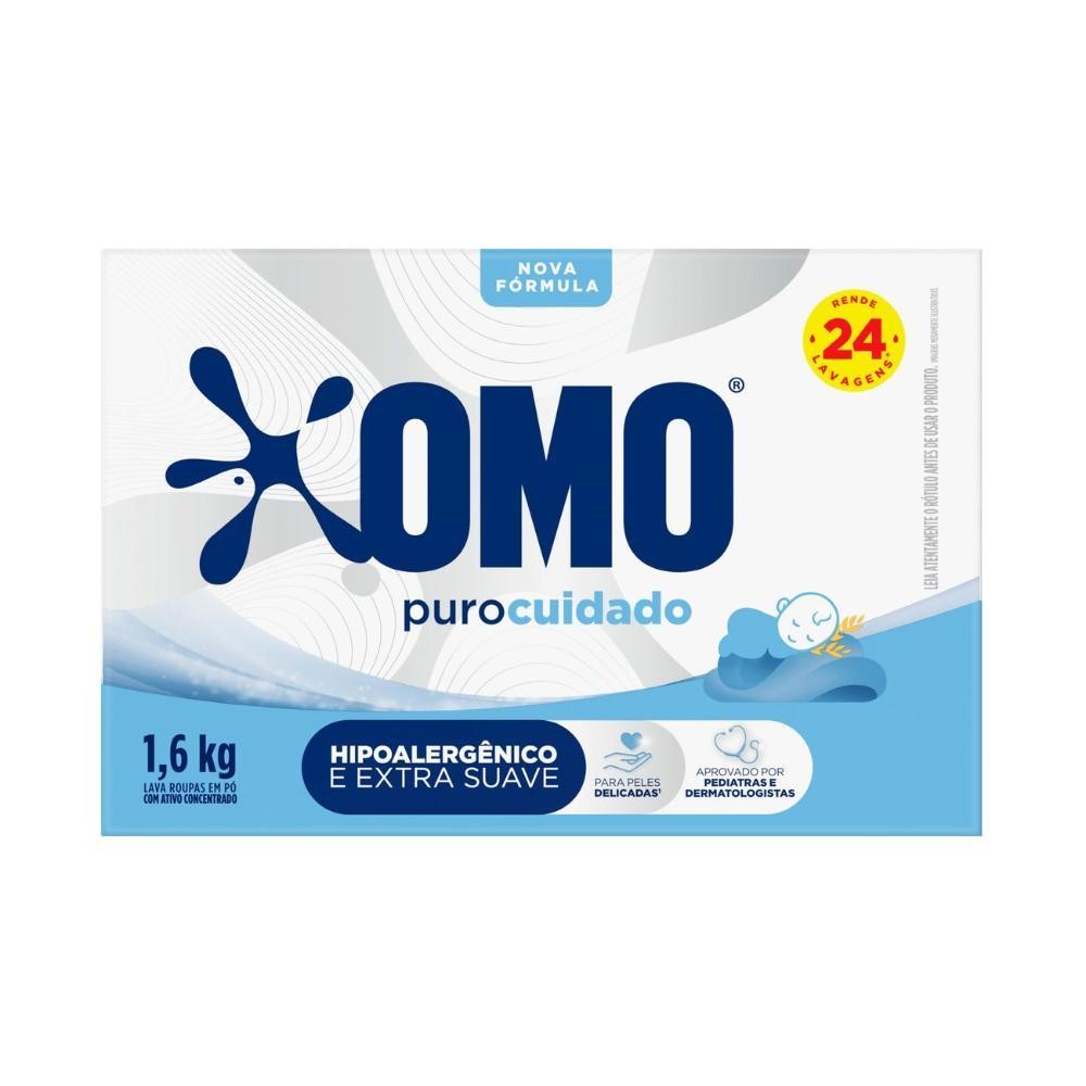 Kit 4 Lava-Roupas em Pó Omo Puro Cuidado 1,6kg O Detergente em pó OMO Puro Cuidado é um sabão em pó desenvolvido especialmente para bebês e pessoas com pele sensível. É hipoalérgico e dermatologicamente testado. Possuí uma fórmula extra suave com PH balanceado, que é extra suave com as roupas e assim não agride a pele. É seguro para lavar as roupinhas de bebês e recomendado por especialistas que testaram o nosso produto e confirmaram que são seguros para o uso habitual. Além disso, os Experts de Fragrância que desenvolveram uma fragrância suave que atende a esse público. Os especialistas em formulações também escolheram cada ingrediente cuidadosamente para entregar a formulação de OMO. OMO Puro Cuidado também cuida do com o meio ambiente. Sua fórmula contém ativo biodegradável; Não possui fosfato, ajudando a preservar rios e oceanos; Economiza água pois precisa de apenas 1 enxágue. * Kit Contém: 4 Lava-Roupas em Pó Omo Puro Cuidado 1,6kg cada * Compre produtos Omo.