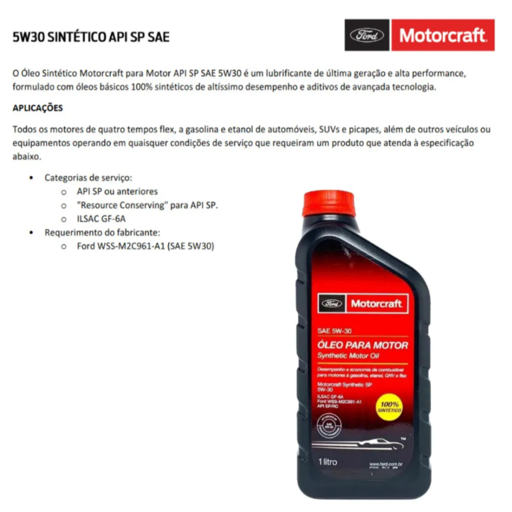 KIT TROCA DE OLEO MOTORCRAFT 5W30 FORD KA ECOSPORT NEW FIESTA ITENS: 4 LITROS DE OLEO MOTORCRAFT 5W30 100% SINTETICO - BXO/5W30/AA/ 1 FILTRO DE OLEO MOTORCRAFT - G3MJ/6714/AA/ 1 FILTRO DE COMBUSTIVEL MOTORCRAFT - G3MJ/9155/BA/ 1 ETIQUETA PARA MARCACAO DE FUTURA TROCA DE OLEO KIT TROCA DE OLEO FORD ECOSPORT; KIT TROCA DE OLEO FORD KA; KIT TROCA DE OLEO FORD NEW FIESTA; KIT TROCA DE OLEO FORD FOCUS WSS-M2C961-A1 API SP APLICACAO: FOCUS 2014/ - 1.6 KA 2013 / 2015 ECOSPORT - 2013-2021 NEW FIESTA 2011/2013 NEW FIESTA 2014/ ?Caso tenha duvidas fornecer o chassi do veiculo para confirmar a aplicacao da peca. ======================================================================= Bem-vindos a Loja Oficial Forauto Parts! Concessionaria autorizada FORD. Ha mais de 55 anos atuando na regiao sul de Santa Catarina e litoral norte do Rio Grande do Sul. Comprometimento e ir mais longe! ======================================================================= Duvidas Frequentes 1. O produto e novo? Produto novo, ORIGINAL e com garantia. 2. A mercadoria esta disponivel a pronta entrega? Todas mercadorias sao para pronta entrega. 3. O produto acompanha nota fiscal? Toda a mercadoria segue acompanhada de nota fiscal emitida para o CPF/CNPJ informado na compra. Em nenhuma das hipoteses efetuamos vendas sem emissao de nota fiscal. 4. Qual horario de atendimento? O horario de atendimento e de segunda a sexta das 08h 18h (exceto feriados). 5. Posso retirar o produto? Sim, para isso, mude a opcao no campo de envio para ?Vou retirar no endereco do vendedor?. Lembrando que retiradas sao apenas para o horario comercial informado acima (4). 6. Para devolucao de produtos, somente com embalagem ORIGINAL e Nota Fiscal. 7. Ainda tem duvidas? -Utilize o campo de perguntas em caso de demais duvidas. ======================================================================= IMAGENS ILUSTR