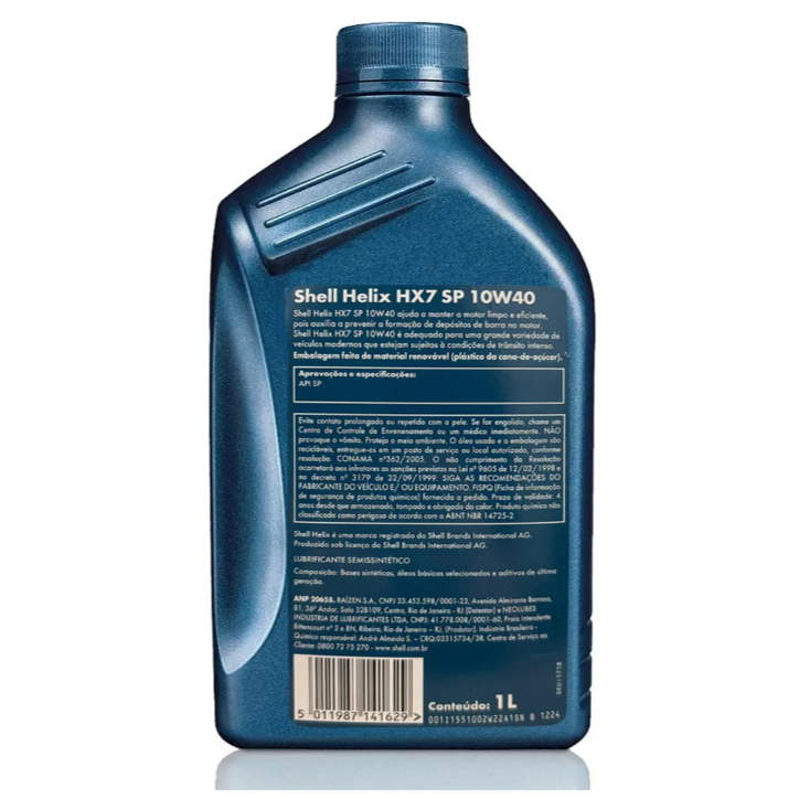 Conteúdo da embalagem: 04 litro Shell Helix HX7 10W-40 SP semissintético 01 Etiqueta troca de óleo **Acompanha etiqueta de quilometragem para marcar a troca de óleo do seu carro** **Produtos à pronta entrega ** O Shell Helix HX7 10W-40 é um lubrificante semissintético ideal para preservar motores submetidos a condições severas, como trânsito intenso ou longas distâncias diárias. Sua tecnologia mantém o motor limpo, previne a formação de borra e permite um funcionamento mais suave e eficiente, prolongando sua vida útil. Tecnologia FlexiMoléculas O produto apresenta moléculas dinâmicas e flexíveis que se adaptam ao estresse do motor. Sob baixas pressões, permanecem inativas, mas, em condições de alta pressão e temperatura, formam barreiras protetoras para aumentar a proteção onde o motor mais precisa. Aplicações Indicações: Motores flex, gasolina, etanol e GNV. Tipo de motor: Veículos movidos a gasolina, etanol, flex (gasolina/etanol), GNV, diesel leve e biodiesel (sem filtro de partículas – DPF). Benefícios AutoStileMotors.