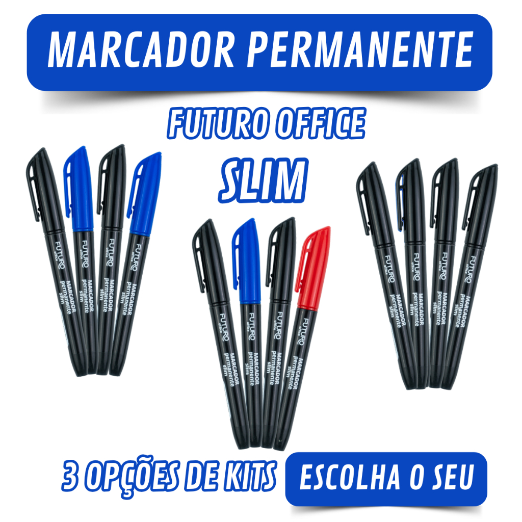 Kit 4 Marcadores Permanentes 4.0 ou Slim 1.5mm Azul, Vermelho e Preto Futuro Office Kit 4 Marcadores Permanentes 4.0 O Marcador Permanente 4.0 é um produto prático e versátil, ideal para diversas aplicações, como uso profissional, escolar e doméstico. Com uma ponta chanfrada de 5mm, o marcador permite a criação de traços que variam entre 2mm e 5mm, atendendo a diferentes tipos de escrita e marcação. Sua tinta permanente, à base de solventes, oferece alta durabilidade e excelente desempenho em diversas superfícies, com secagem rápida e resistência ao desbotamento. O marcador também conta com um clip no corpo, tornando-o prático para transporte e fácil de guardar. Sua composição inclui materiais de alta qualidade, como resina termoplástica, que proporciona resistência e durabilidade, e ponta de fibra, que assegura precisão e conforto durante o uso. Além disso, o produto é atóxico, garantindo segurança para diferentes tipos de usuários. Dimensões: Altura: 2,2cm. Largura: 2,2cm. Comprimento: 12,6cm. Kits: - 2 marcadores pretos + 1 marcador azul + 1 marcador vermelho. - 4 marcadores pretos. - 2 marcadores pretos + 2 marcador azul. Kit 4 Marcadores Permanentes Slim 1.5mm. O Marcador Permanente Slim ideal para diversas aplicações, como uso profissional, educacional e doméstico, ele oferece precisão e qualidade para atender às mais variadas necessidades. Com uma ponta redonda de 4mm, o marcador permite traços finos que variam entre 1mm e 2mm, tornando-o ideal para escrita e marcação com detalhes. Sua tinta permanente, à base de solventes, proporciona alta durabilidade, secagem rápida e resistência ao desbotamento em diversas superfícies. Além disso, o marcador possui um clip, facilitando o transporte e o armazenamento. Fabricado com materiais de alta qualidade, sua composição inclui resina termoplástica, que confere resistência e durabilidade ao corpo do marcador, e ponta de fibra, que garante precisão e conforto durante o uso. O produto é atóxico, sendo seguro para diferentes públicos e aplicações. Dimensões: Altura: 1,6cm. Largura: 1,6cm. Comprimento: 13,6cm. Kits: - 2 marcadores pretos + 1 marcador azul + 1 marcador vermelho. - 4 marcadores pretos. - 2 marcadores pretos + 2 marcador azul. Cores Disponíveis: azul, vermelho e preto. A tonalidade das cores pode variar de acordo com sua tela e iluminação do ambiente. Disponível para pronta entrega. Enviamos para todo Brasil. Emitimos Nota Fiscal!