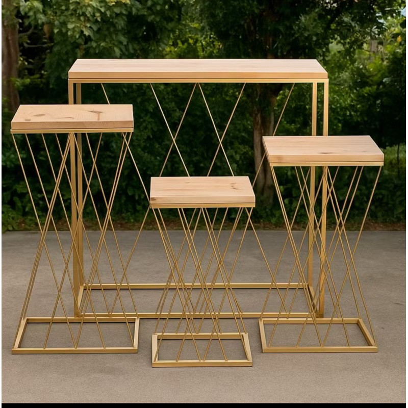 Kit de Mesas Decorativas com Tampo de Madeira Pinus – 4 Peças Transforme qualquer ambiente com elegância e modernidade com este incrível kit de mesas decorativas. Com estrutura em ferro e tampo em madeira pinus natural, as peças trazem leveza, estilo e versatilidade para composições de festas, eventos ou até mesmo para decorar sua casa. O kit contém 4 MESAS • 4 tampas de madeira pinus nos tamanhos correspondentes Com design geométrico e acabamento sofisticado, esse conjunto é perfeito para criar um cenário moderno, acolhedor e cheio de personalidade. Destaques: • Estrutura em ferro com pintura eletrostática • Tampo em madeira pinus natural • Fácil de montar, desmontar e transportar • Ideal para decoração de festas, casamentos, vitrines ou uso residencial