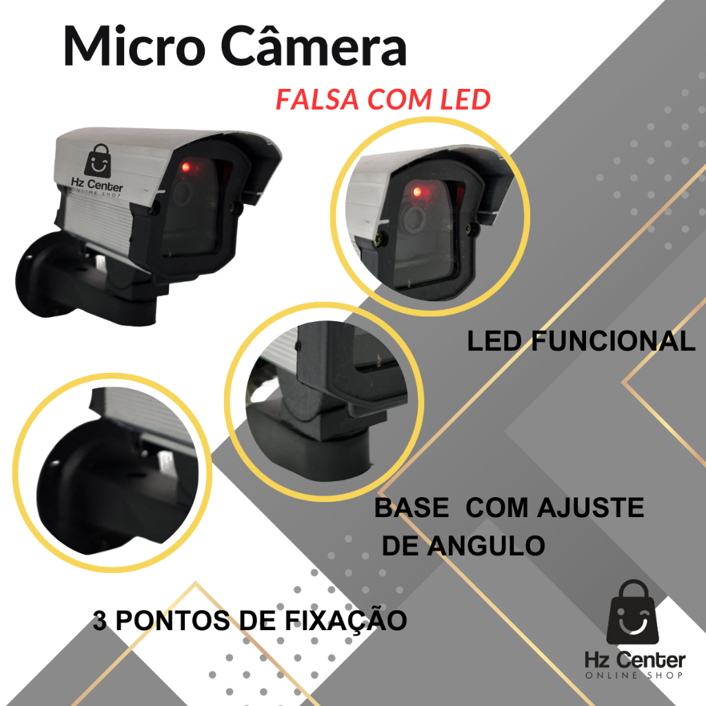 A Câmera Falsa é um simulador de câmera, que causa um efeito psicológico de estar sendo vigiado, inibindo eventuais intensões de intrusão ou roubo. Ela pode ser instalada na rede de energia elétrica tanto 127v ou 220 V . Como também ser instalada com uma Bateria 9V. Confeccionado em alumínio tratado e anodizado na cor cinza e espessura de 1,8mm. Possui suporte ajustável na cor preta visor de vidro e led que indica que o dispositivo está ligado , oferecendo maior veracidade ao produto . O acesso ao compartimento interno pode ser feito através das tampas dianteira ou traseira . Pode ser usado em ambientes internos ou externos . *** NÃO ACOMPANHA PARAFUSOS *** ITENS INCLUSOS : 04 MICRO CÂMERAS FALSAS 04 PLACAS AMBIENTE MONITORADO POR CÂMERAS