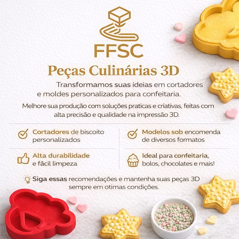 Kit Moldes Ejetores para Brigadeiro – Dia das Mães – Confeitaria Criativa 🍪 Encante seus clientes e transforme suas criações com este kit exclusivo de marcadores e cortadores! Perfeito para confeitaria artística, biscoitos, pasta americana, biscuit e artesanato em geral. Tamanho 3,5 cm - ideal para brigadeiros entre 15g a 22g ✨ Detalhes do produto: ✔ Impressão 3D de alta qualidade ✔ Acabamento preciso para detalhes bem definidos ✔ Leve, resistente e fácil de usar ✔ Ideal para profissionais e iniciantes Observações importantes: - Não usamos tinta nos produtos. A matéria prima já é na cor impressa. -Conservar em local seco e fresco. - Não pode ir ao fogo, ou ser aquecido pois em contato com altas temperaturas poderá deformar -Não lavar com agua quente, Material: PLA Cor: Aleatória – a cor do anúncio é ilustrativa. Será enviado qual estiver disponível Fabricação própria
