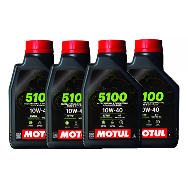 KIT 4 OLEO MOTUL 5100 4T 10W40 Óleo Motul 5100 Desenvolvido para todo tipo de motos urbana, trail, todo terreno, enduro, equipadas com motores de 4 tempos, com embreagem e caixa de velocidades integradas ou não, motores que respondam às especificações anticontaminantes Euro II ou Euro III, com sistemas de pós tratamento de gases de escapamento catalisadores, injeção de ar do escapamento. Outras aplicações Motos de uso diário, Scooters, Quadriciclos, Ciclomotores sem sistema catalítico. •Tipo 5100 10W40 •Especificação CCMC G4, API SG •Normas API SL/SJ/SH/SG •Homologação JASO MA nº. M033MOT057 Proteção Lubrificante Technosynthèse, reforçado com básicos de Éster para garantir melhores propriedades antidesgaste e assegurar a longevidade das engrenagens da caixa de velocidades. Melhora a resistência do filme de óleo em elevadas temperaturas. Grau SAE 50 adaptado aos motores de alta cilindrada. Sua composição é inerte aos equipamentos de controle de gases contaminantes. Não danifica os catalisadores. Conforto Homologação JASO MA para garantir um perfeito bloqueio da embreagem e evitar deslizamentos indesejados. Melhora a operação de trocas de marchas. Conselhos de utilização Trocas conforme recomendação do fabricante e/ou adaptável à severidade de uso. Pode ser misturado com outros tipos de óleos sintéticos e minerais. Características técnicas •Grau de Viscosidade SAE J 300 10W40 • Densidade a 20°C (68°F) ASTM D 1298 0.878 • Viscosidade a 100°C (212°F) ASTM D 445 17.6 mm²/s •Viscosidade a 40°C (104°F) ASTM D 445 130.0 mm²/s •Índice de Viscosidade ASTM D 2270 149 •Ponto de Fluidez ASTM D 97 -39°C / -38°F •Ponto de Fulgor ASTM D 92 232°C / 449°F •TBN ASTM D 2896 8.2 mg KOH/g •Foto Ilustrativa Conheça o Kit 4 Óleo Motul 5100 4T 10W40: A Escolha Perfeita para sua Moto - Paulinho Motos Encontre o melhor para sua moto: KIT 4 Óleo Motul 5100 4T 10W40 na Paulinho Motos. Lubrificação de qualidade que protege e otimiza o desempenho.