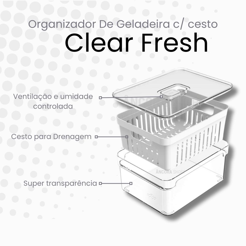 t 4 Organizadores de Geladeira Clear Fresh Ou – 2 Unidades 2,2L com Cesto de Drenagem + 2 Unidades com Bandeja Mantenha sua geladeira sempre organizada, prática e higiênica com o Kit Clear Fresh Ou. Pensado para quem busca unir funcionalidade e design moderno, este conjunto traz versatilidade para o dia a dia, ajudando a conservar melhor seus alimentos e otimizar cada espaço da geladeira. O kit é composto por: 2 Organizadores de 2,2L com Cesto de Drenagem Removível → perfeitos para frutas, legumes e verduras, pois evitam contato direto com a umidade e prolongam a durabilidade dos alimentos. 2 Organizadores com Bandeja Removível → ideais para temperos, frios, snacks e pequenos itens que precisam de organização prática e acesso rápido. Todos os organizadores possuem estrutura em acrílico transparente de alta resistência, que facilita a visualização dos alimentos, tampa removível que protege e permite empilhamento, além de um design clean que combina elegância e funcionalidade. Diferenciais do Kit Conserva alimentos frescos por mais tempo Estrutura em acrílico transparente para rápida visualização Cesto de drenagem removível (2 peças) – ideal para frutas e legumes Bandeja removível (2 peças) – organização prática para frios, temperos e snacks Tampa removível que facilita o empilhamento Otimiza o espaço interno da geladeira Material leve, resistente e durável Design clean e moderno Medidas de cada organizador Altura: 9,5 cm Largura: 15 cm Comprimento: 20 cm Peso: 0,35 kg Capacidade: 2,2 Litros Especificações Técnicas Marca: Ou | Linha Clear Fresh Material: Acrílico (PS + PP) Cor: Transparente Acabamento: Liso e translúcido Garantia: 3 meses contra defeito de fábrica