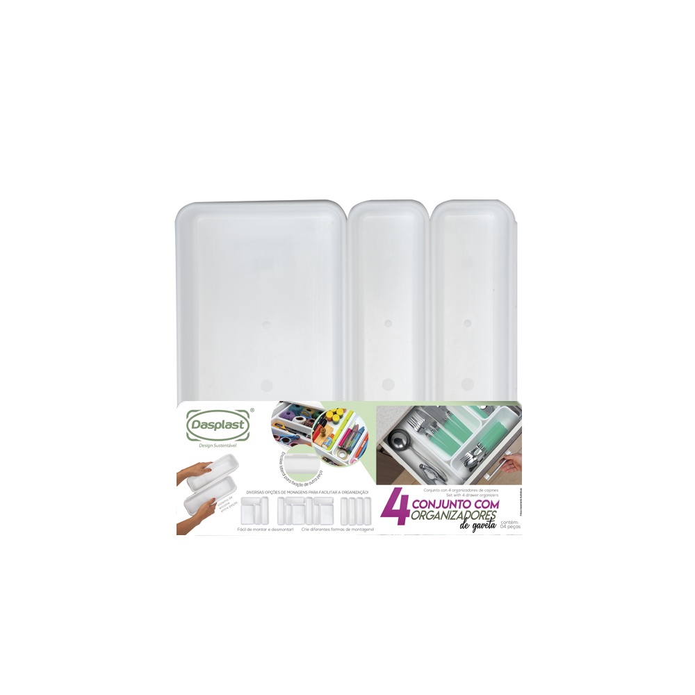 Organize agora suas gavetas!! Com apenas um movimento, você junta uma peça na outra e monta layout que combina mais com sua gaveta. São vários tamanhos disponíveis e inimagináveis opções para você organizar suas gavetas da cozinha, escritório ou o que você estiver precisando! Ótimos para organizar talheres na sua cozinha. São fabricadas em polipropileno de alta resistência, que proporciona durabilidade ao produto. Disponível na cor branca. =========================================== ESPECIFICAÇÕES: - Material: DasPlast - Linha sustentável - Comporta: Talheres ou pequenos utensílios. DIMENSÃO E PESO: - Dimensão do organizador de talheres: 27cm (C) x 34,5cm (L) x 5,5cm (A) - Peso Aproximado: 0,450 kg Organizadores: -2 pequenos. -1 médio. -1 grande. =========================================== Qualquer dúvida, sinta-se à vontade para entrar em contato com nossa equipe, estaremos prontos para te atender.