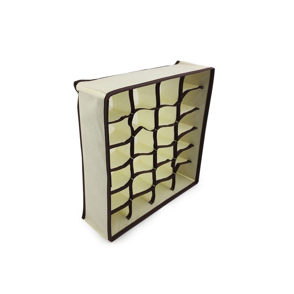 Características O Organizador de Gavetas é produzido em TNT e possui 24 divisórias, ideal para organizar roupas intimas, meias, cuecas e calcinhas de forma em que você tenha a visão de tudo que está guardado, facilitando na hora de escolher oque vestir. Especificações Técnicas - Material: TNT - 24 divisórias - Fácil de guardar - Serve em Gavetas de 31x31cm ou maiores - Dobrável, pode guardar empilhados Peso e Medidas Aproximadas - Altura: 31cm - Largura: 31cm - Peso: 150g Itens Inclusos - 04 Organizador de Gavetas