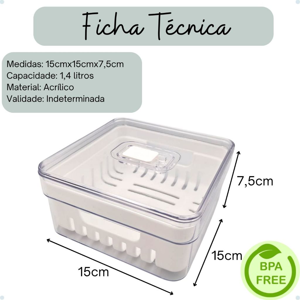 Apresentando a vocês: Kit com 4 Organizadores de Geladeira com Cesto e Tampa com Controle de Ventilação - 1,4 LITROS. ********************************************************************************************************* Uma revolução na forma de armazenar verduras, legumes e frutas na geladeira! Quantas vezes você já teve que jogar fora verduras e legumes porque quando foi usar estavam estragados? Quanto tempo você gasta para preparar uma salada tendo que higienizar tudo na hora? Uma boa higienização leva tempo e ela é essencial para evitar muitos riscos a nossa saúde e da nossa família. Os organizadores de geladeira foram especialmente desenvolvidos para promover o frescor prolongado de verduras, frutas e legumes, mantendo uma rotina sem desperdícios. Ao armazenar os alimentos já limpos e higienizados você terá muita praticidade e vai economizar muito tempo no preparo das refeições. Empilhe, encaixe e enxergue facilmente os alimentos armazenados na geladeira, mantendo tudo em ordem. ********************************************************************************************************* ENVIA AINDA HOJE? R: Temos todos os produtos em estoque e em no máximo 24 horas úteis seu pedido já estará com a transportadora. QUAL A CAPACIDADE? E O TAMANHO? R: 1,4 LITROS. Medidas: L 15cm x C 15cm x A 7,5cm COMO USAR A VÁLVULA DE CONTROLE DE VENTILAÇÃO? R: Para alimentos sensíveis como folhas ou vegetais que murcham, utilize a válvula fechada, exemplos: Alface, Rúcula, Beterraba, Brócolis, Couve, Repolho, Cenoura, Couve-flor, Couve, Berinjela. Alimentos cortados sempre utilizar com a válvula fechada. Para frutas ou vegetais com casca, utilize a válvula aberta, exemplos: Maçã, Manga, Abacate, Tomate, Melão, Laranja, Pêssego, Melancia, Pêra, Pepino, Pimenta, Ameixa, Uvas, Kiwi; PODE SER COLOCADO NA LAVA-LOUÇAS? R: Não deve ir à lava-louças, nem ao freezer ou ao micro-ondas. A limpeza é bem simples, lave com sabão neutro e esponja macia (parte amarela), evitando produtos abrasivos no processo de limpeza. ********************************************************************************************************* Benefícios: > Praticidade e agilidade no preparo de refeições; > Alimentos frescos por mais tempo; > Menos desperdício de comida, mais economia; > Super transparência para enxergar o conteúdo e manter tudo em ordem; > Empilhável, facilita a organização e otimiza o espaço da geladeira; > Tampa com ventilação ajustável para cada tipo de alimento; > Com cesto de drenagem, evita que os alimentos fiquem molhados após a lavagem. ********************************************************************************************************* Ficha Técnica: Medidas: L 15cm x C 15cm x A 7,5cm Capacidade: 1,4 LITROS Material: Acrílico BPA Free: Livre de BPA Validade: Indeterminada ********************************************************************************************************* O que você vai receber? 4 Organizadores de Geladeira com Cesto e Tampa com Controle de Ventilação - 1,4 LITROS. ********************************************************************************************************* INSTITUCIONAL: Nosso objetivo é entregar de forma ágil e profissional produtos de qualidade. Trabalhamos sempre para superar as expectativas de nossos clientes e fazer com que eles tenham uma experiência única. GARANTIA: Enviamos os produtos bem embalados. Todos os produtos têm garantia de troca/devolução dentro de 7 dias após o recebimento.