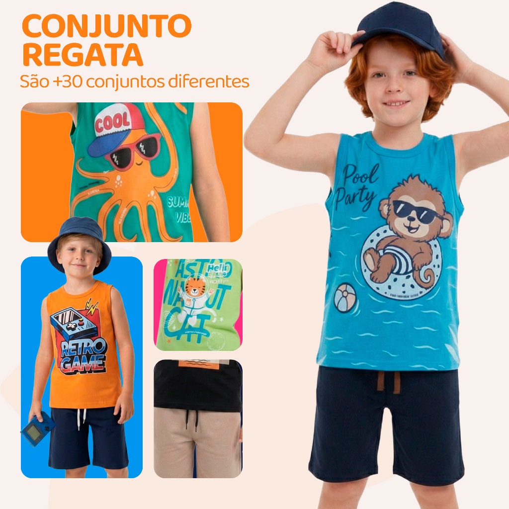 Este anúncio oferece três opções de escolha para você personalizar o seu pedido: Kit com 2 conjuntos sortidas: Receba 4 peças no total ( Enviaremos 2 Regatas + 2 bermudas, selecionadas de forma variada conforme nosso estoque disponível.) Kit com 4 conjuntos sortidas: Receba 8 peças no total ( Enviaremos 4 Regatas + 4 bermudas, selecionadas de forma variada conforme nosso estoque disponível.) Recomendamos os tamanhos de acordo com a idade, mas lembre-se de verificar nossa tabela de medidas para o ajuste perfeito: Recomendação por tamanho : Tamanho 1 - Indicado para crianças de 6 a 12 meses. Tamanho 2 - Ideal para pequenos de 1 ano. Tamanho 3 - Vestindo os garotinhos de 2 anos com estilo. Tamanho 4 - Perfeito para crianças de 3 anos. Tamanho 6 - Adequado para meninos de 4 a 5 anos. Tamanho 8 - Encaixando bem nos pequenos de 6 a 7 anos. Tamanho 10 - Feito sob medida para crianças de 8 a 9 anos. Nossas camisetas são produzidas com meia malha 100% algodão, possuem gola redonda reforçada, garantindo durabilidade e conforto. As bermudas são feitas em moletinho 85% algodão e possuem um elástico confortável na cintura. Este conjunto é a combinação perfeita de resistência, maciez e conforto, sendo ideal para dias mais quentes, passeios e momentos de lazer. Além disso, é versátil e prático para os pais. Não perca essa oportunidade incrível de lançamento na Polo Infantil Store e garanta já o seu Kit de conjuntos. ATENÇÃO: Enviaremos modelos variados de acordo com a disponibilidade em estoque. Não é possível escolher modelos específicos. O tamanho do conjunto não corresponde à idade da criança. Camiseta: 100% algodão. Bermuda: 85% algodão.