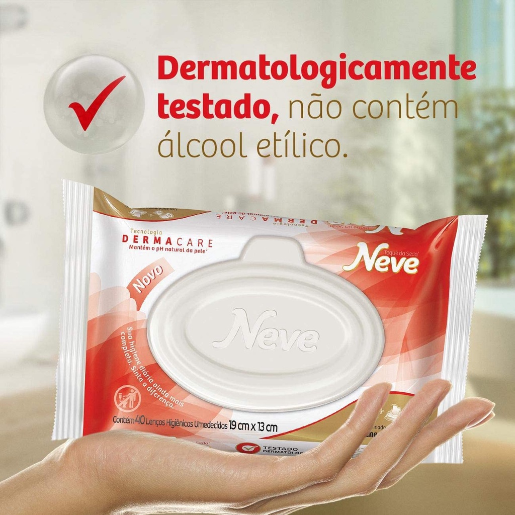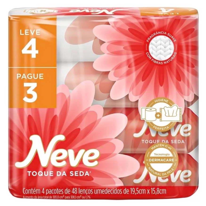 Lenços Umedecidos Neve Toque Da Seda Pac C/4 - 48Uni O Neve Toque de Seda é um lenço umedecido de uso diário, indicado para complementar a higiene íntima, principalmente de adultos. Com tecnologia Dermacare com Pré-Bio Dermatológico, o Lenço Umedecido Neve Toque de Seda possui fragrância suave e proporciona uma limpeza completa, mantendo o pH natural da pele.