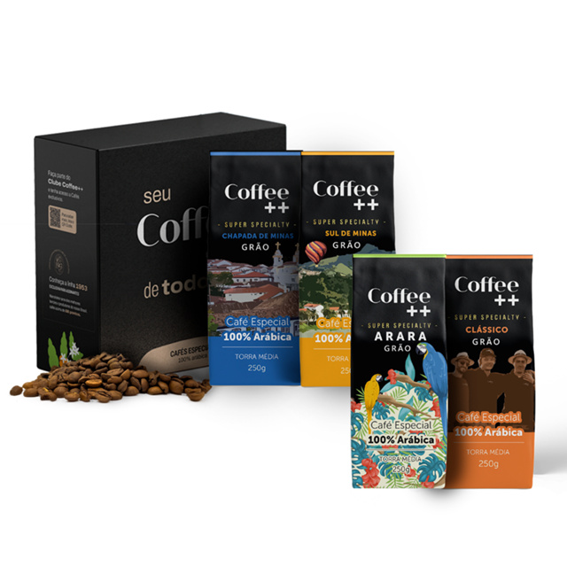 SEU KIT GRÃOS COM SUAS VARIEDADES FAVORITAS: Esse Kit contém 4 pacotes de café em Grãos de 250 gramas cada um. Não sabe qual Café experimentar primeiro? Procurando o presente perfeito, mas não consegue decidir qual café enviar? Ou talvez você apenas goste de tomar sua bebida matinal para combinar com seu humor. Nosso Kit Grãos está aqui para ajudar! O kit Grãos inclui quatro pacotes de nossos cafés de origem única mais populares. CLÁSSICO - notas de Chocolate com doce de Leite. CHAPADA DE MINAS - Notas sensoriais de frutas amarelas caramelizadas com chocolate. SUL DE MINAS - Notas de licor de laranja e frutas amarelas. ARARA - Equilíbrio, delicadeza e doçura natural logo no primeiro gole. Assim, o café Arara mostra potência de sabor e notas de chocolate, caramelo, além de lembranças de frutas amarelas. Esse café 100% arábica tem o aroma como uma das características mais marcantes, ao lado da acidez baixa, corpo elevado e muito aroma. 100% ARÁBICA - O Coffee ++ oferece grãos superespeciais e 100% arábica, que são cultivados com processos criteriosos em altas altitudes no Brasil. Na xícara, esse café tem sabor marcante, doçura natural, notas sensoriais e aromas únicos. CAFÉ ESPECIAL X CAFÉ TRADICIONA - Café especial é a potência de sabor, com grãos 100% arábicas, torra média, aspectos sensoriais diferenciados, acidez equilibrada e doçura natural. Já o café tradicional pode ter a mistura de grãos Robustas (conilon), o que significa mais concentração de cafeína, amargor e ausência de aspectos sensoriais. Que tal abandonar o café queimado e conhecer o doce natural dos grãos especiais? Recado Importante! Como produzimos em larga escala não é possível informar qual a data da torra que chegará para você, mas todas as nossas torras são feitas com frequência para que você receba o nosso café bem fresquinho.