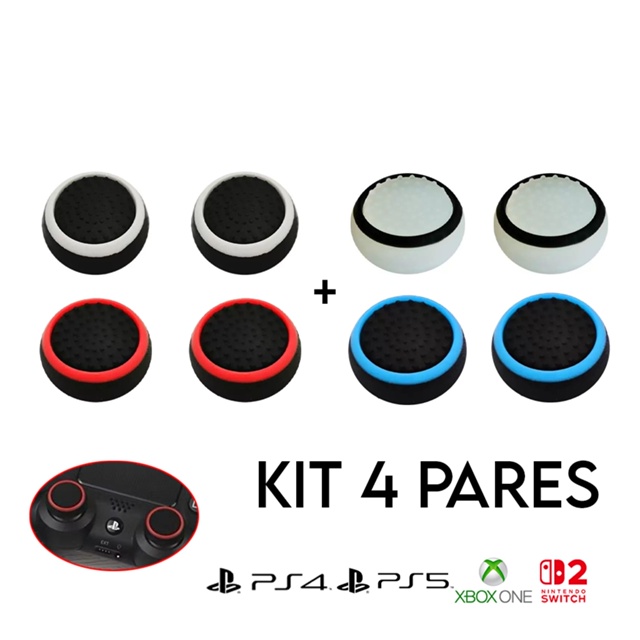 | Kit 4 Pares 8 unidades de Grip Silicone Botão Ps3 Ps4 Ps5 Xbox Wii ... este produto | R$ 11,50 | — | 4.9/5 | 50 |