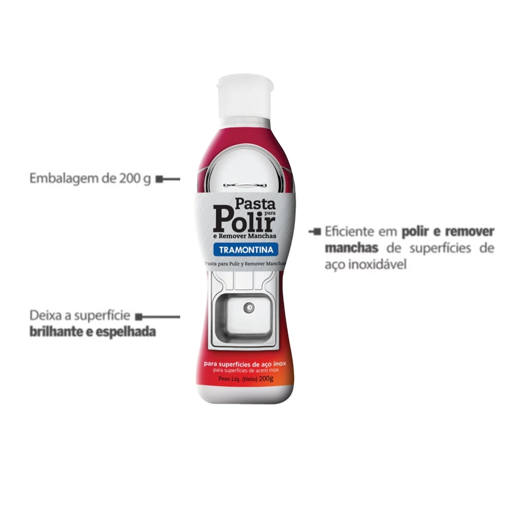 Quem é que não gosta de ver as louças de sua cozinha brilhando, não é? Pois as suas panelas de Aço Inox e seu faqueiro ficarão brilhando com a Pasta para Polimento e Remoção de Manchas em Aço Inox Tramontina 200 g. A pasta, que não possui produtos tóxicos em sua composição, também remove manchas em superfícies esmaltadas ou pintadas, podendo ser utilizada em pias, chaleiras, baixelas, fogões, refrigeradores, máquinas de lavar louça, fornos e o que mais você precisar. Deixe sua casa brilhando com a Pasta para Polir da Tramontina. Informações Gerais Produto para polir e remover manchas em superfícies de aço inoxidável, esmaltadas ou pintadas. Pode ser utilizado para remoção de manchas em pias, panelas, chaleiras, baixelas, fogões, refrigeradores, máquinas de lavar louça, fornos, torneiras, etc. O produto remove manchas das superfícies proporcionando condições para um polimento brilhante. Composição: Tensoativo não iônicos, conservantes, coadjuvantes e água. Sem produtos tóxicos. Não contém solventes em sua formulação.