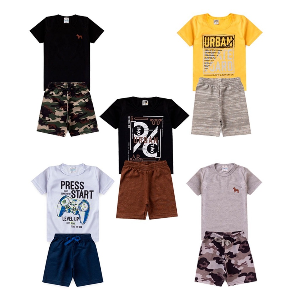 Kit 4 peças 2 conjuntos camisa infantil 2 blusas e 2 bermudas tamanhos 1 ao 10
