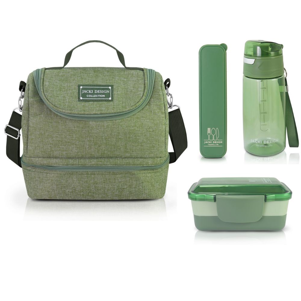 Bolsa Térmica Marmita Copo Porta Talher Kit 4 Peças Joy Kit Bolsa Térmica + Marmita + Garrafa + Porta Talher A nova coleção JOY, foi criada pensando em oferecer mais praticidade e estilo para o consumidor moderno! BOLSA TÉRMICA: Duplo compartimento, feita multicamadas e folha de alumínio para manter seu alimento fresco e bem conservado. Possui 2 compartimentos, fecho de zíper e alça lateral removível. Tamanho Bolsa Térmica: Comprimento 23 cm x Largura 14 cm x Altura 23 cm MARMITA: Agora ficou mais fácil organizar seus alimentos para um dia longo. A marmita de 950 ml possui 2 andares, podendo ser usado em conjunto ou separadamente. Feito de material polipropileno, é resistente e possui tampa com travas para segurança evitando acidentes. Produto livre de BPA com qualidade Jacki Design . (INSTRUÇÕES DE USO: Retire a tampa antes de levar ao micro-ondas; usar somente para aquecer comida, não para cozinhar; Vai ao freezer e lava-louças; Temperatura de uso: -20°C ~120°C; Limpe usando uma esponja macia e detergente). Tamanho Marmita: Comprimento 19 cm x Largura 13 cm x Altura 9 cm GARRAFA SQUEEZE: Tem capacidade de 500ml. Possui trava de segurança, alça para transporte. Ideal para atividades físicas, escola ou escritório. Leve e fácil de carregar. Produto com qualidade Jacki Design. (INSTRUÇÕES DE USO: Não vai ao micro-ondas; Temperatura de uso: -20°C ~80°C; Limpe usando uma esponja macia e detergente) . Composição: Tampa: AS / Garrafa: PET Tamanho: Comprimento: 7,5 cm x Largura: 7,5 cm x Altura: 19 cm PORTA TALHER: Um item essencial para transportar com higiene e segurança seus talheres. Feita de material Polipropileno, ele é compacto e fácil de limpar. Composição: Polipropileno Tamanho: Comprimento 25 cm x Largura 6 cm x Altura 3 cm Pronta Entrega!