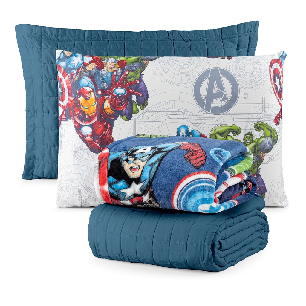 Kit 4 Peças Colcha e Manta Solteiro Disney Homem Aranha Vingadores Homem Ferro Capitão América Antialérgica Super Heroi