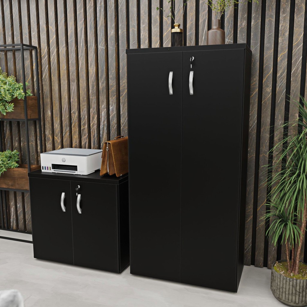 Kit 4 Peças com Mesa para Escritório, Gaveteiro e 2 Armários Preto